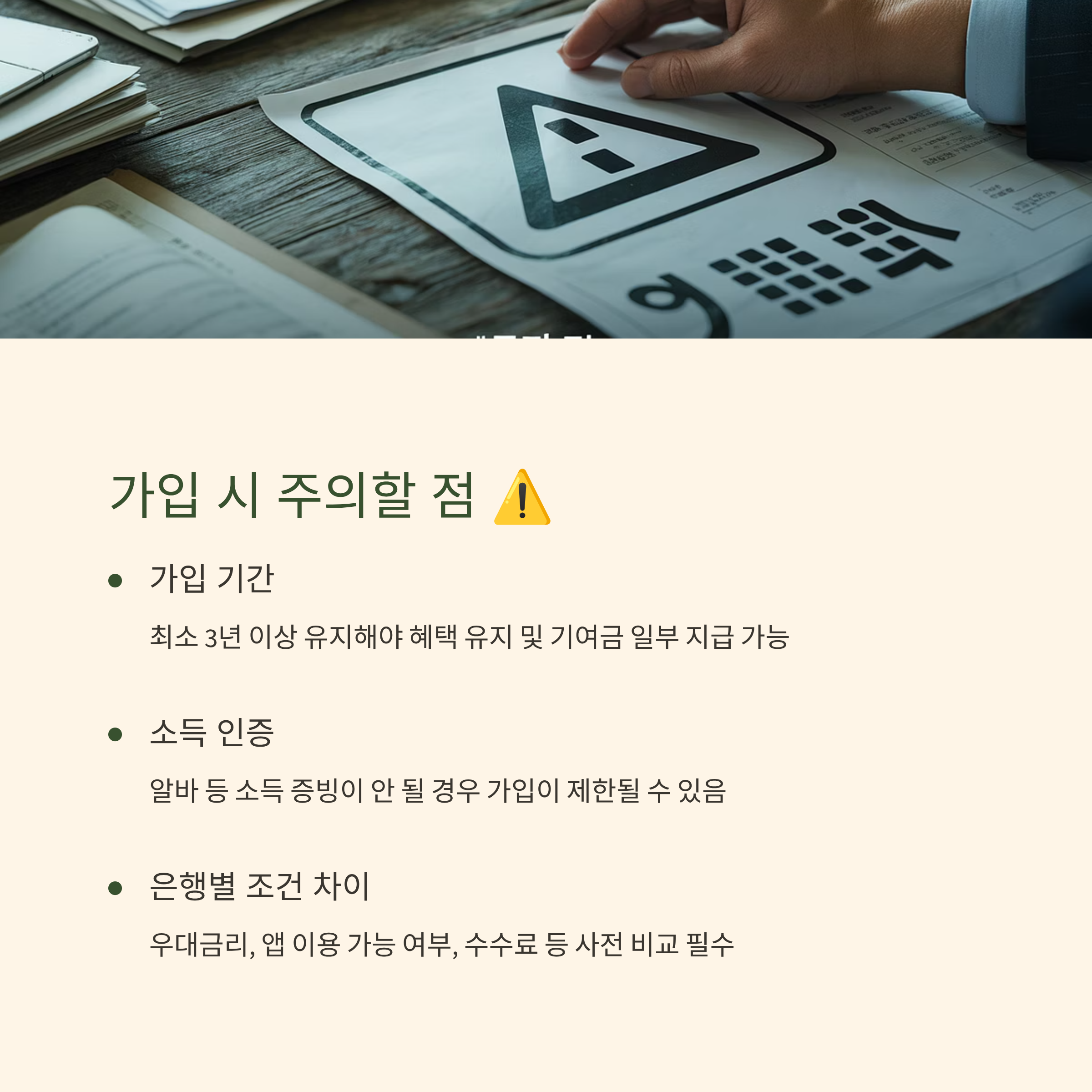 가입을 결심했다면 가입 가능한 은행별 조건 비교, 소득증빙 서류 준비, 자동납입 설정까지 모두 체크하시고.