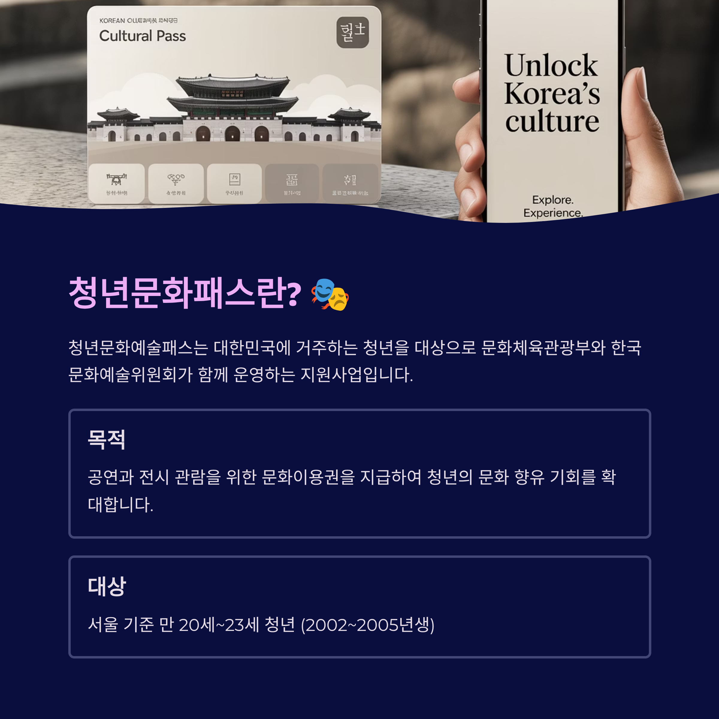- 관람 가능 장르 유의: 팬미팅, 강연, 영화제 등은 제외되며 공연 및 전시 중심의 예술 콘텐츠만 해당(youthculturepass.or.kr)