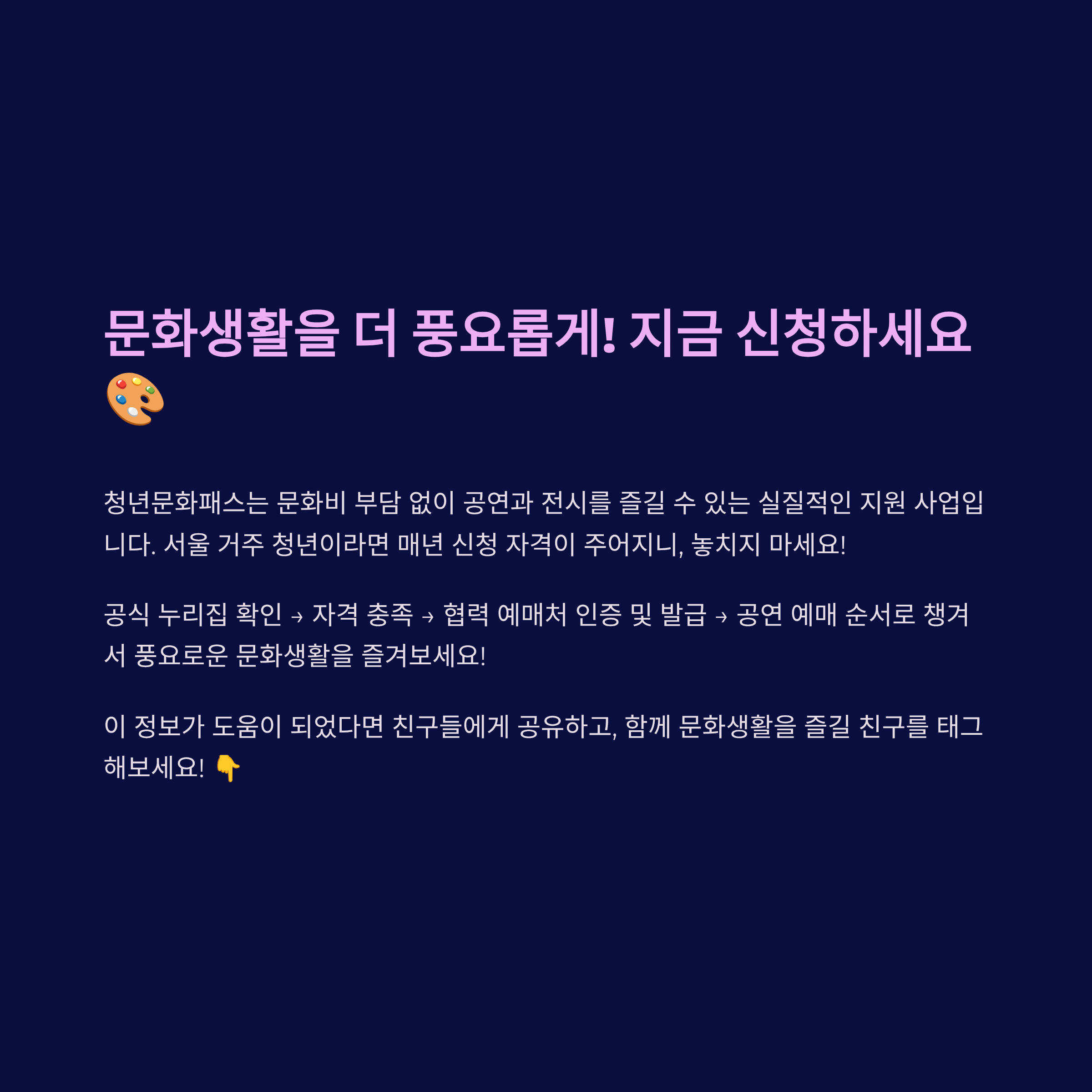 서울 거주 청년이라면 매년 신청 자격이 주어지니, 공식 누리집 확인 → 자격 충족 → 협력 예매처 인증 및 발급 → 빠르게 공연 예매해 문화생활 즐기기 순서로 챙기면 좋겠어요!