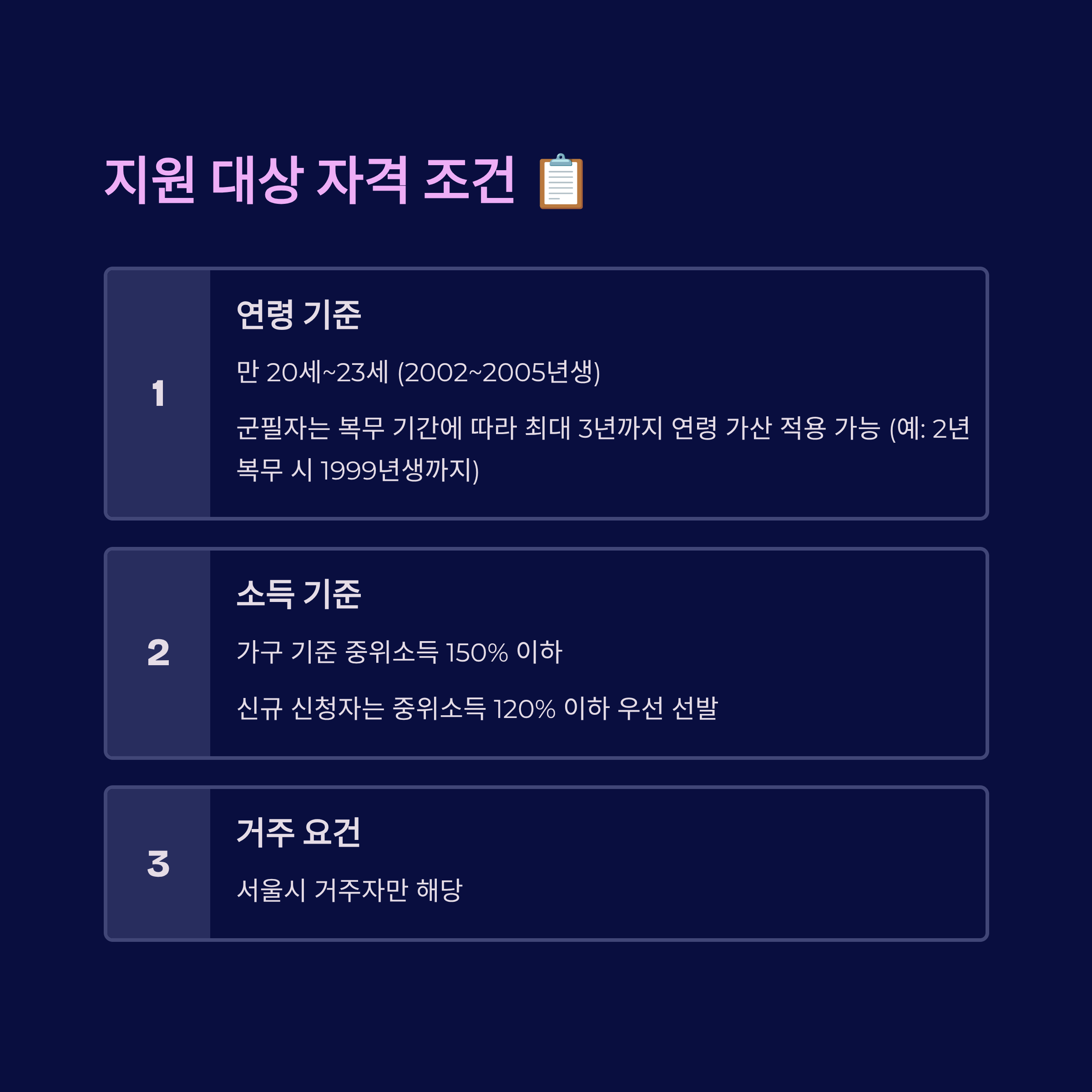 | 대상 연령 | 만 20~23세 서울 거주 청년 (군필자는 최대 3년 연령 가산) |