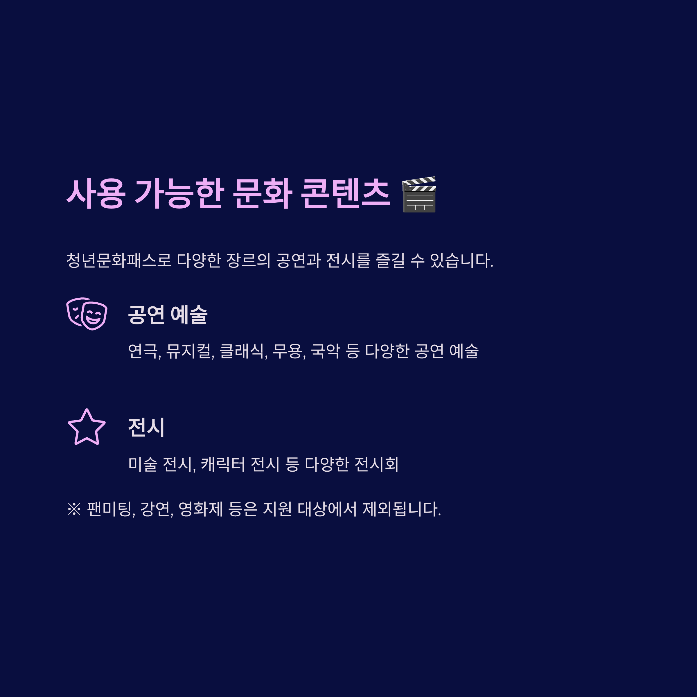 • 관람 가능 장르 유의: 팬미팅, 강연, 영화제 등은 제외되며 공연 및 전시 중심의 예술 콘텐츠만 해당(youthculturepass.or.kr)