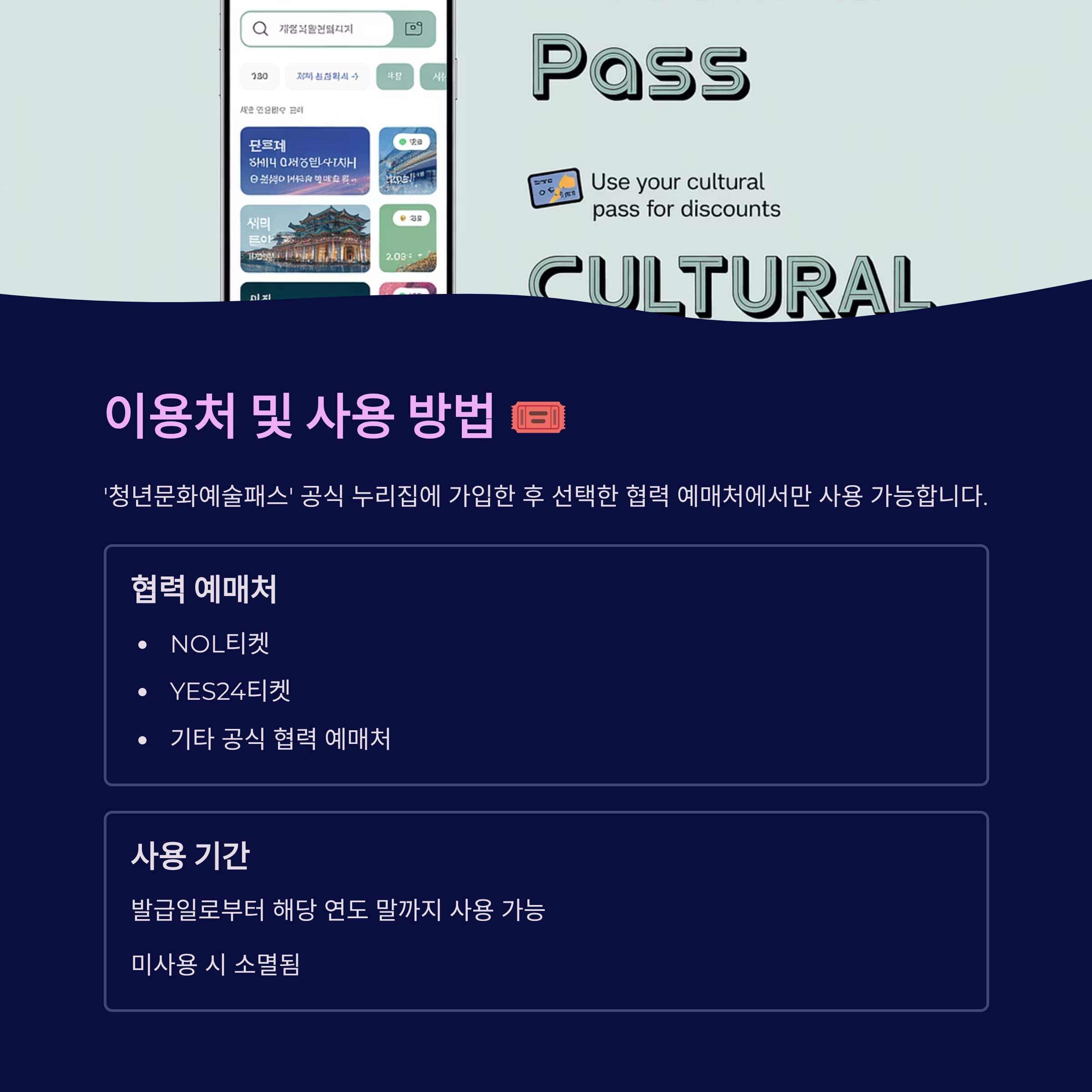 - 이용처: '청년문화예술패스' 공식 누리집 가입 후 선택한 협력 예매처 (예: NOL티켓, YES24티켓 등)에서만 사용 가능(youthculturepass.or.kr)