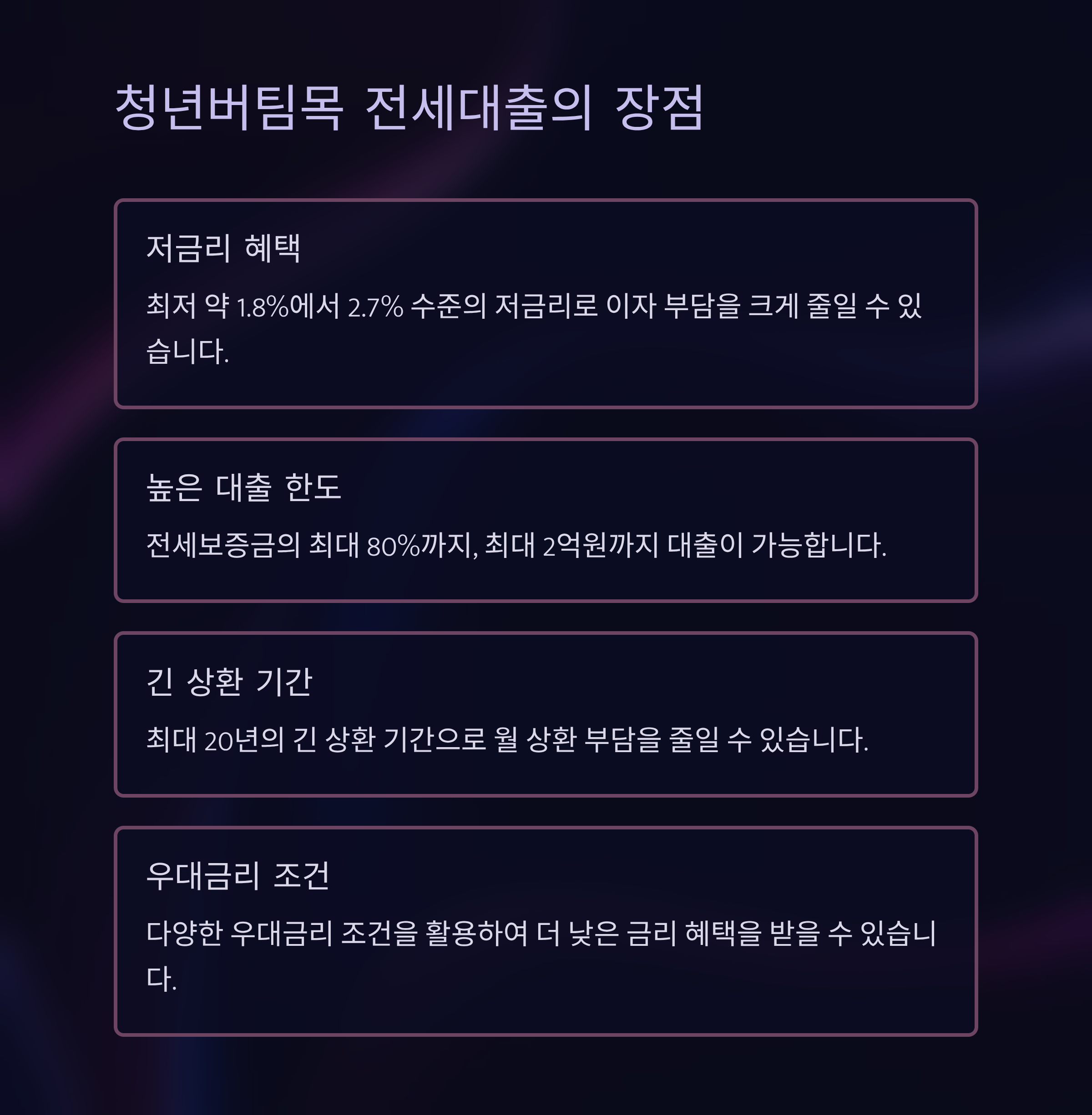 | 대출 한도 | 전세보증금 최대 80% 내, 최대 2억 원 |
