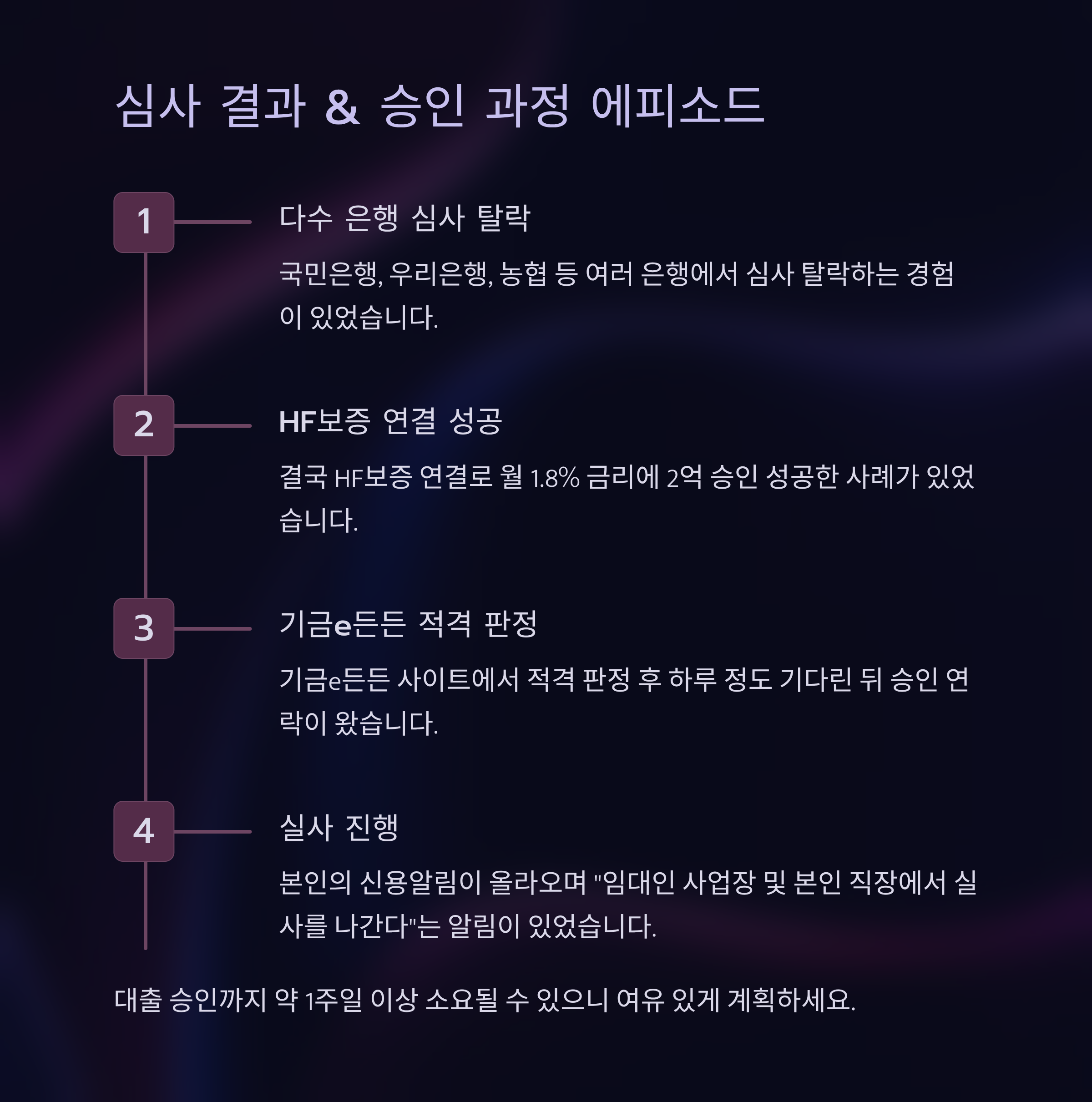 - 본인의 신용알림이 올라오며 “임대인 사업장 및 본인 직장에서 실사를 나간다”는 알림이 있었다는 후기도 있었어요 (잡다한 이야기).