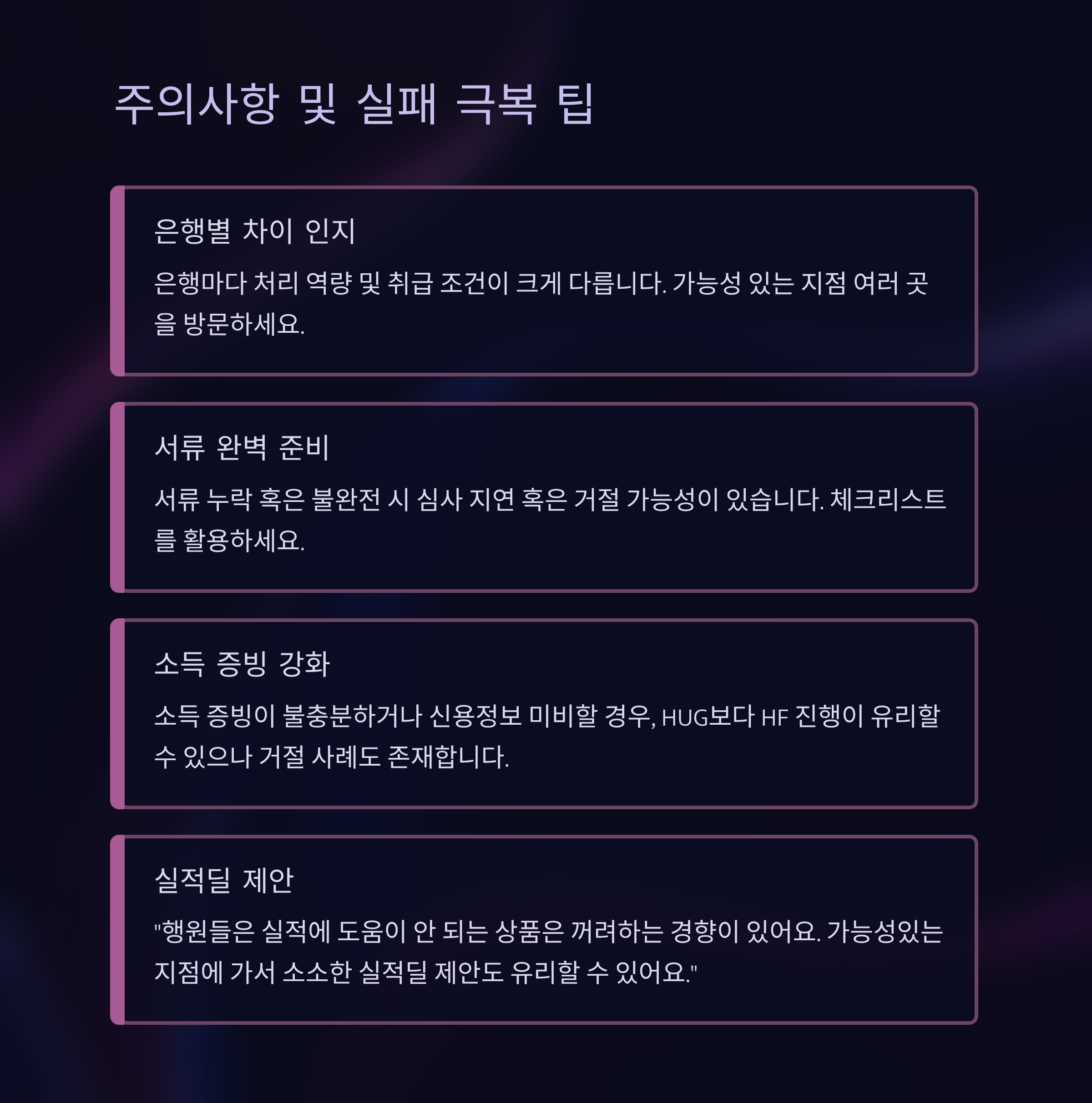 - 소득 증빙이 불충분하거나 신용정보 미비할 경우, HUG보다 HF 진행 유리할 수 있으나 거절 사례도 존재 (Brunch Story, Blind)