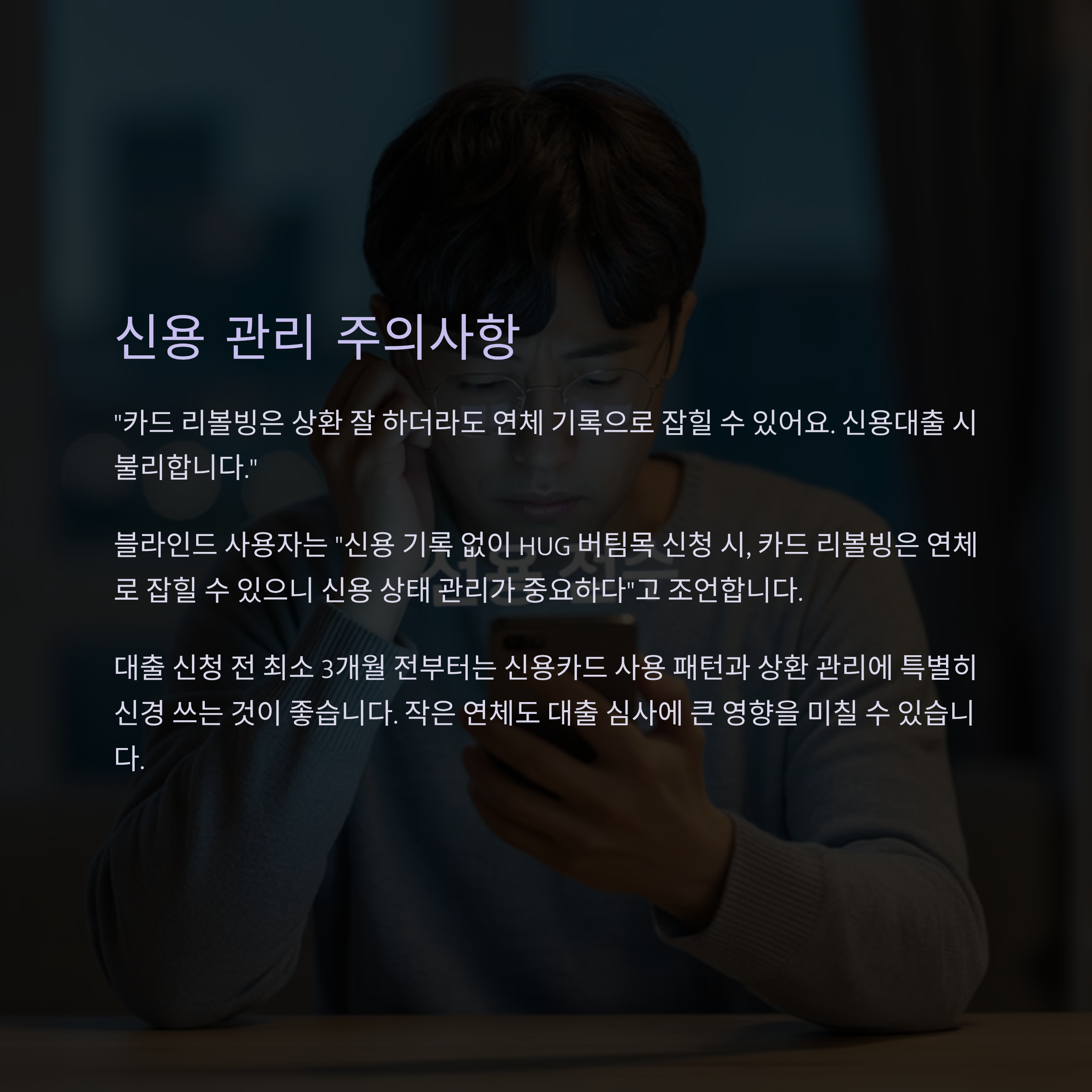 - 블라인드 사용자도 “신용 기록 없이 HUG 버팀목 신청 시, 카드 리볼빙은 연체로 잡힐 수 있으니 신용 상태 관리 중요”이라고 조언합니다 (Blind).