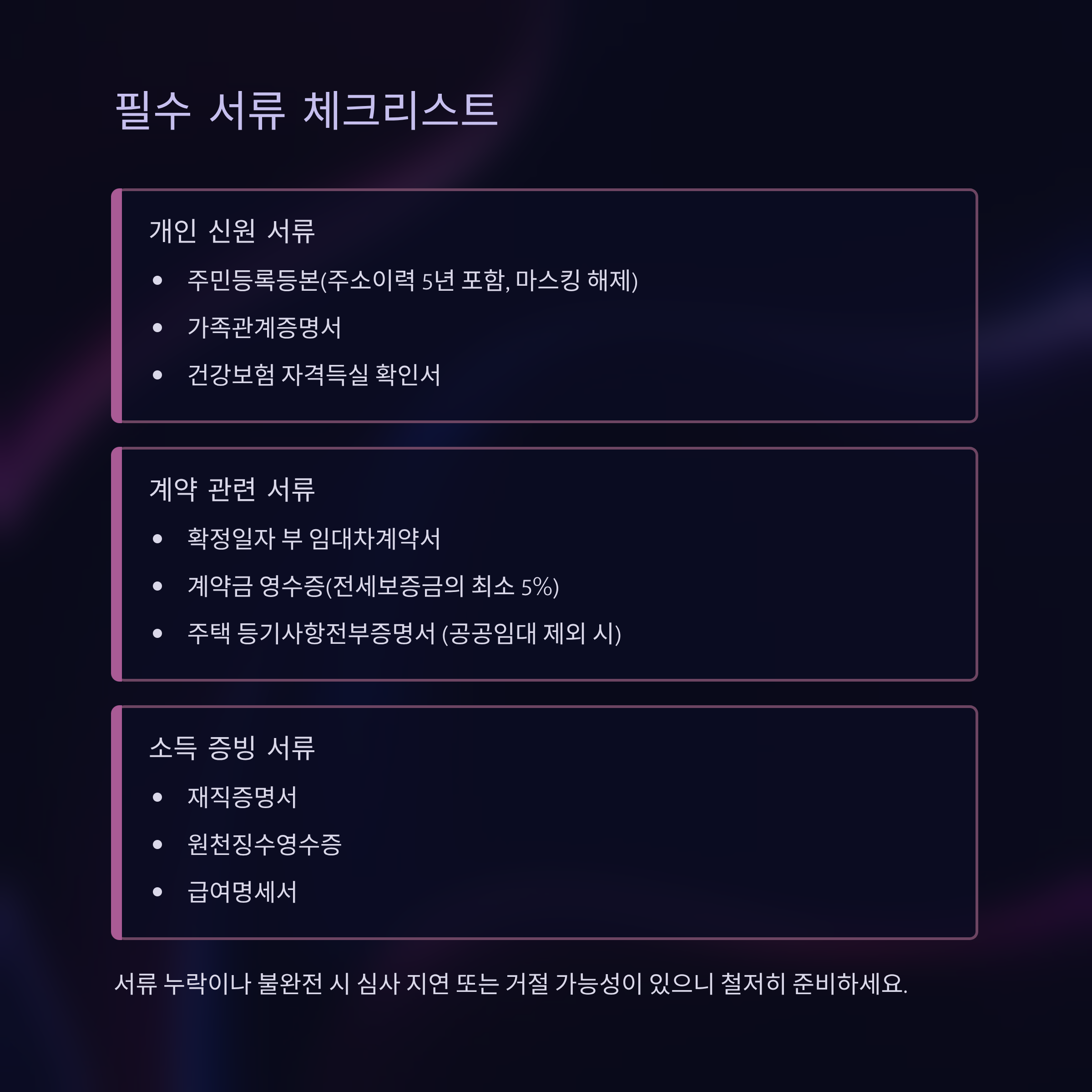 - 서류 누락 혹은 불완전 시 심사 지연 혹은 거절 가능성 있음