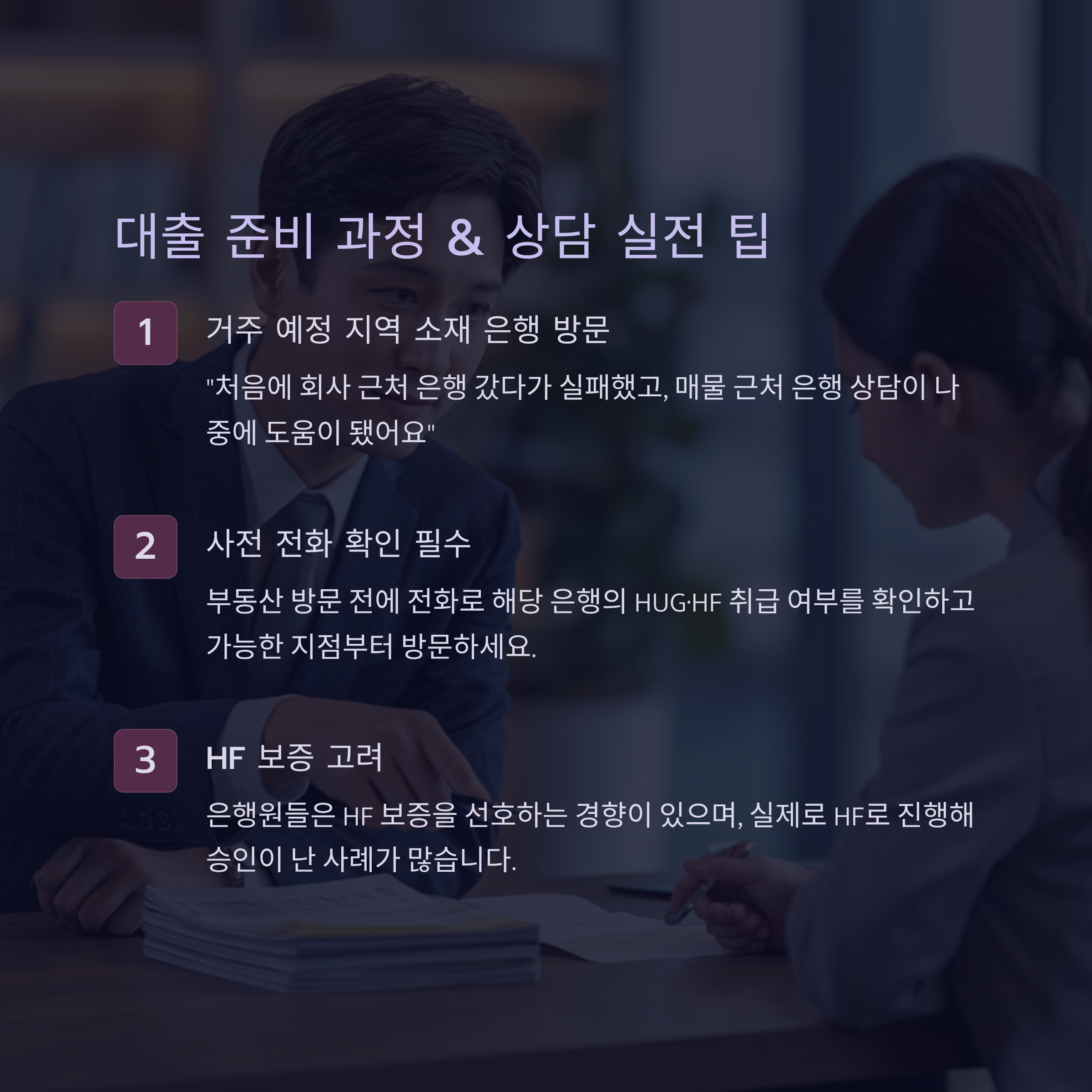 블로그 후기에서는 “처음에 회사 근처 은행 갔다가 실패했고, 매물 근처 은행 상담이 나중에 도움이 됐어요” 라는 경험담이 나옵니다 (잡다한 이야기). - 부동산 방문 전에 전화로 해당 은행의 HUG·HF 취급 여부를 확인하고 가능한 지점부터 다니는 것이 효율적입니다. 불필요한 발품을 줄일 수 있어요 (Brunch Story).