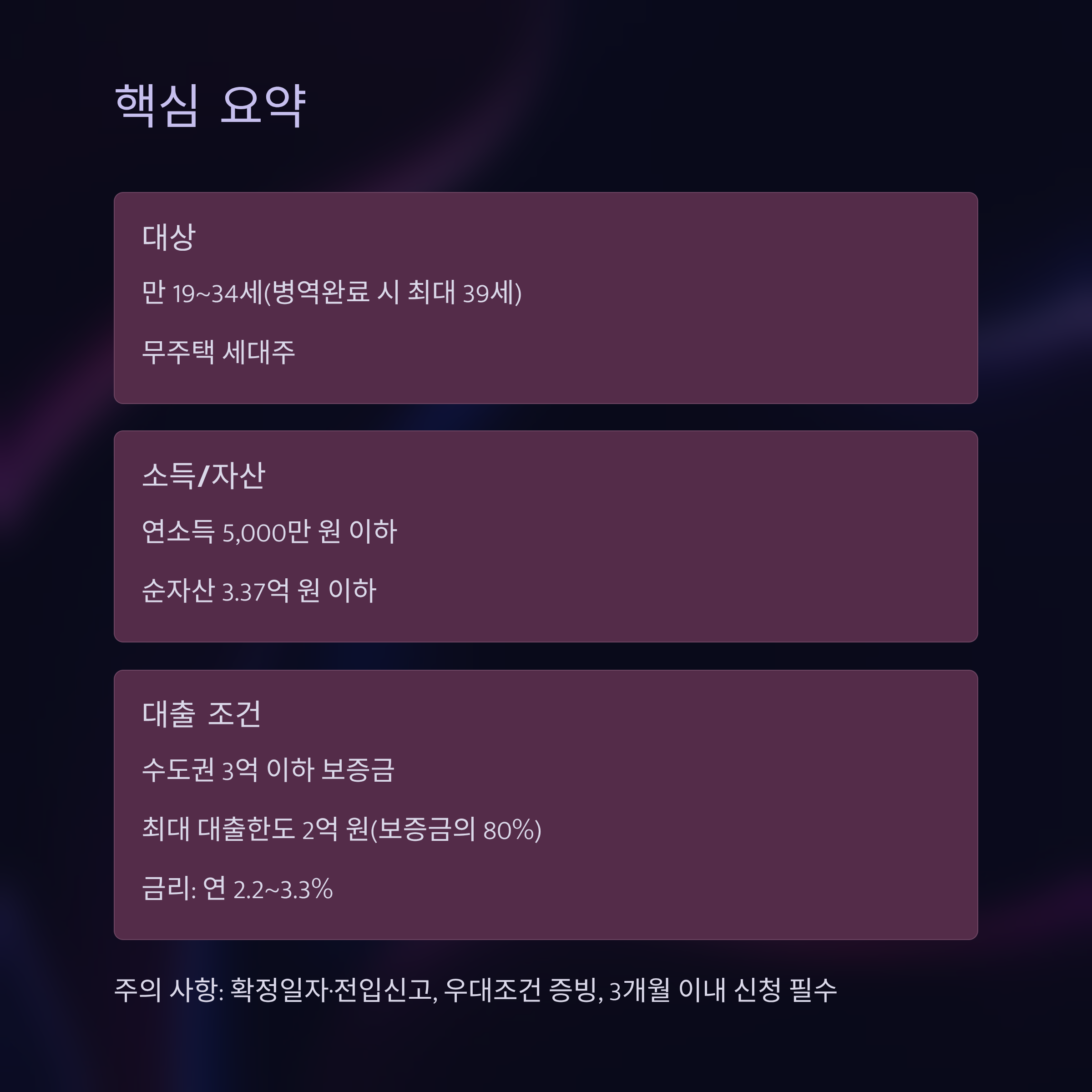 - 대상: 만 19~34세(병역완료 시 최대 39세), 무주택 세대주
