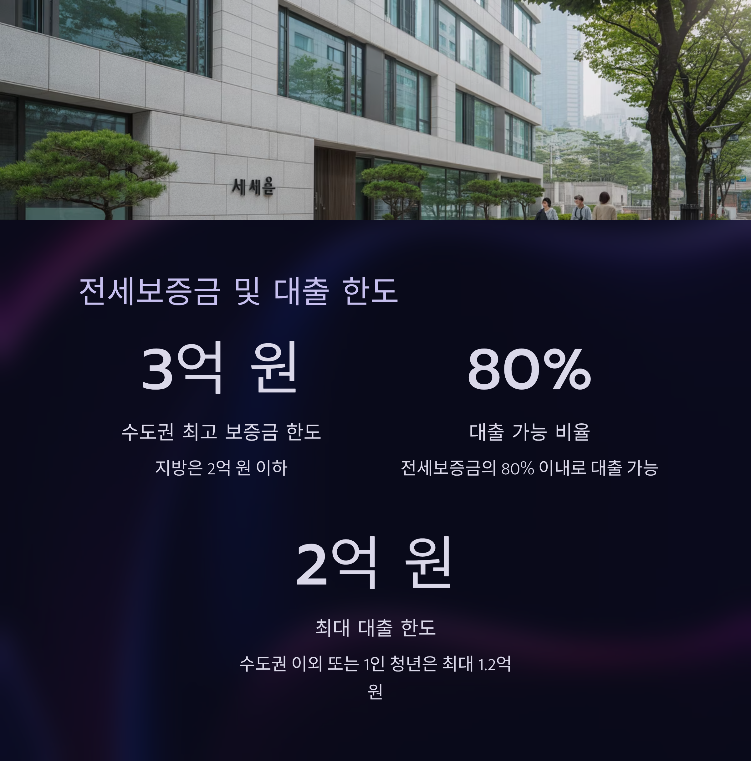 - 보증금 조건: 수도권 3억 이하, 최대 대출한도는 2억 원 (보증금의 80%)