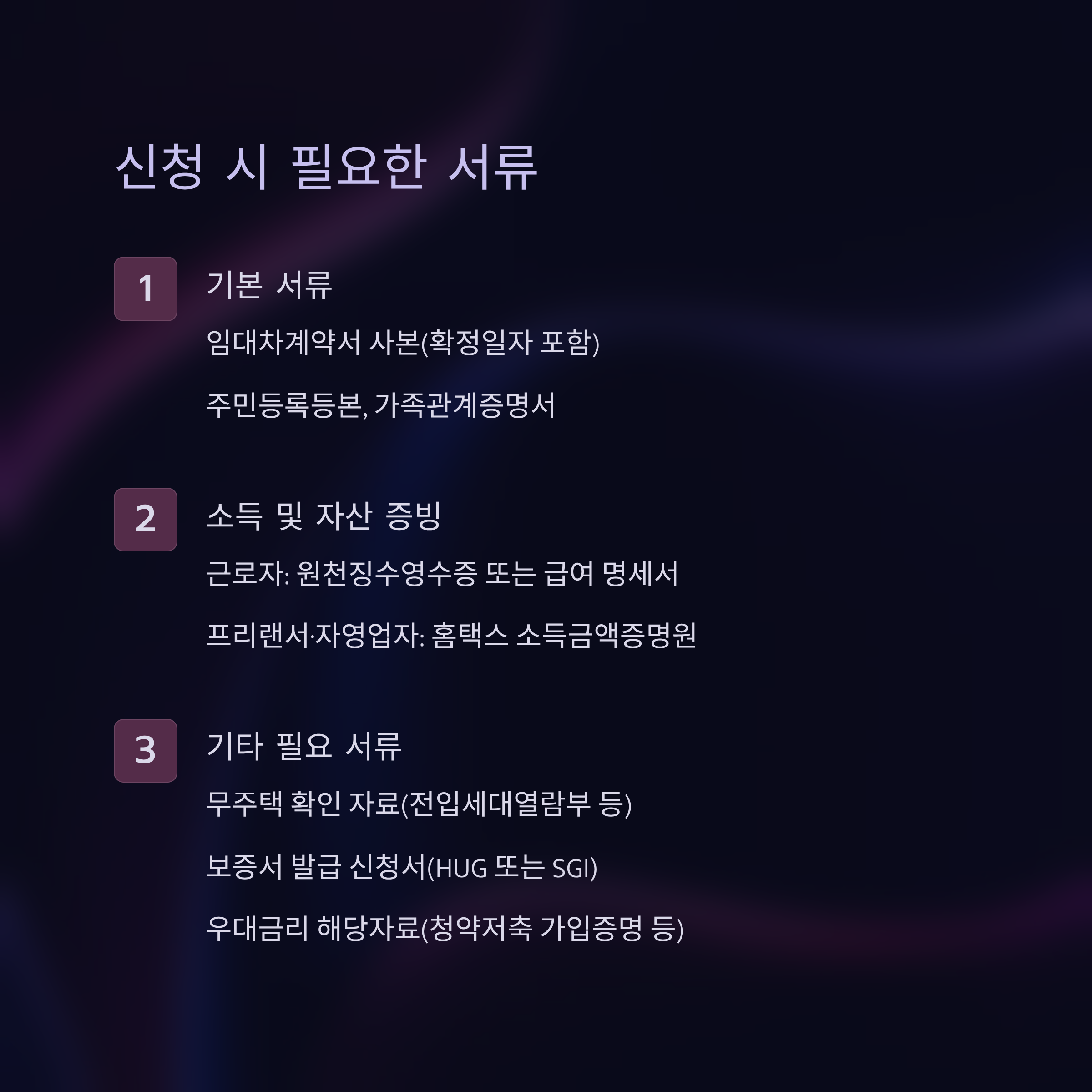 - 필수 서류: 계약서, 소득증빙, 무주택 확인, 보증서 등