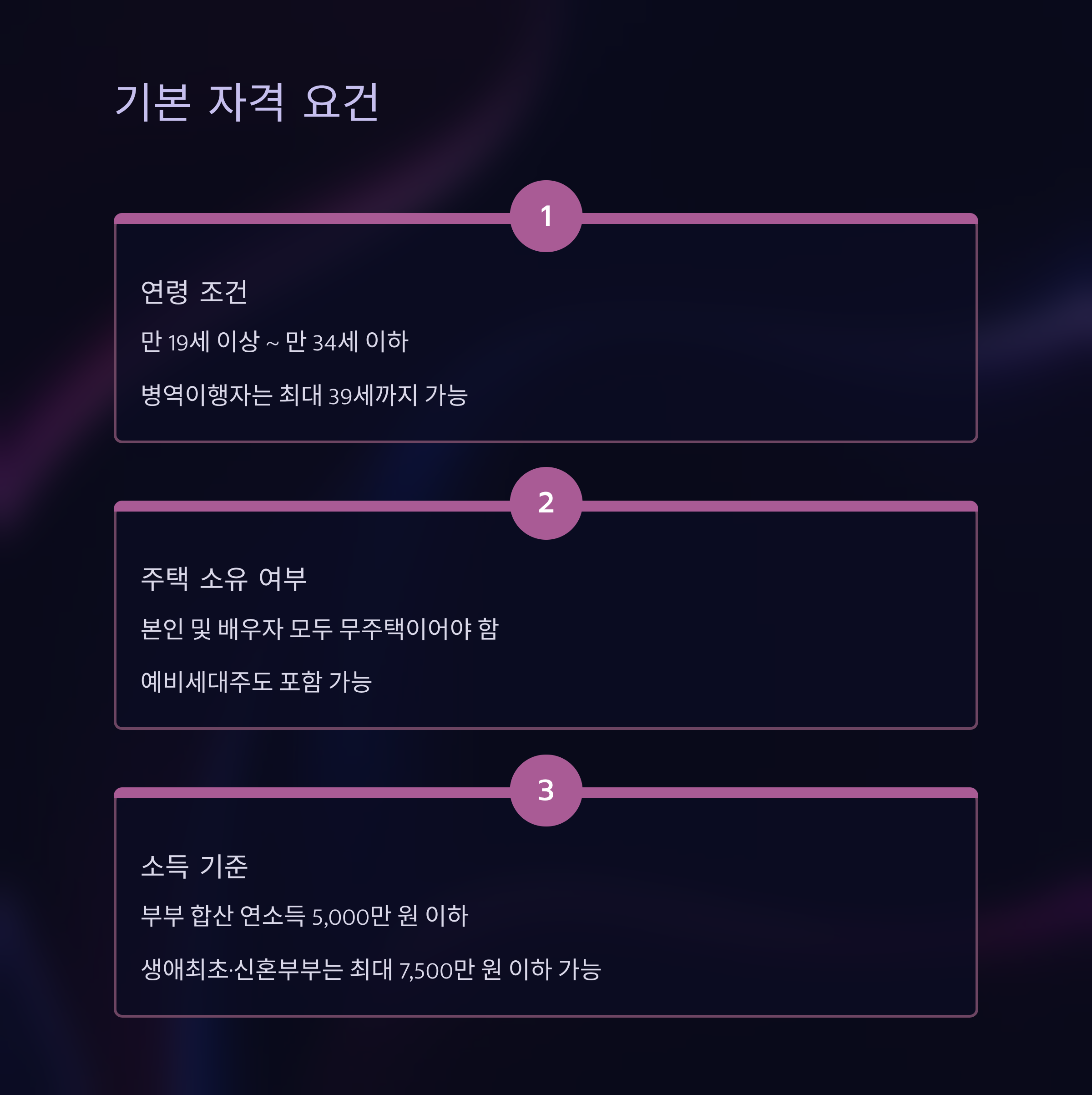 - 대상: 만 19~34세(병역완료 시 최대 39세), 무주택 세대주