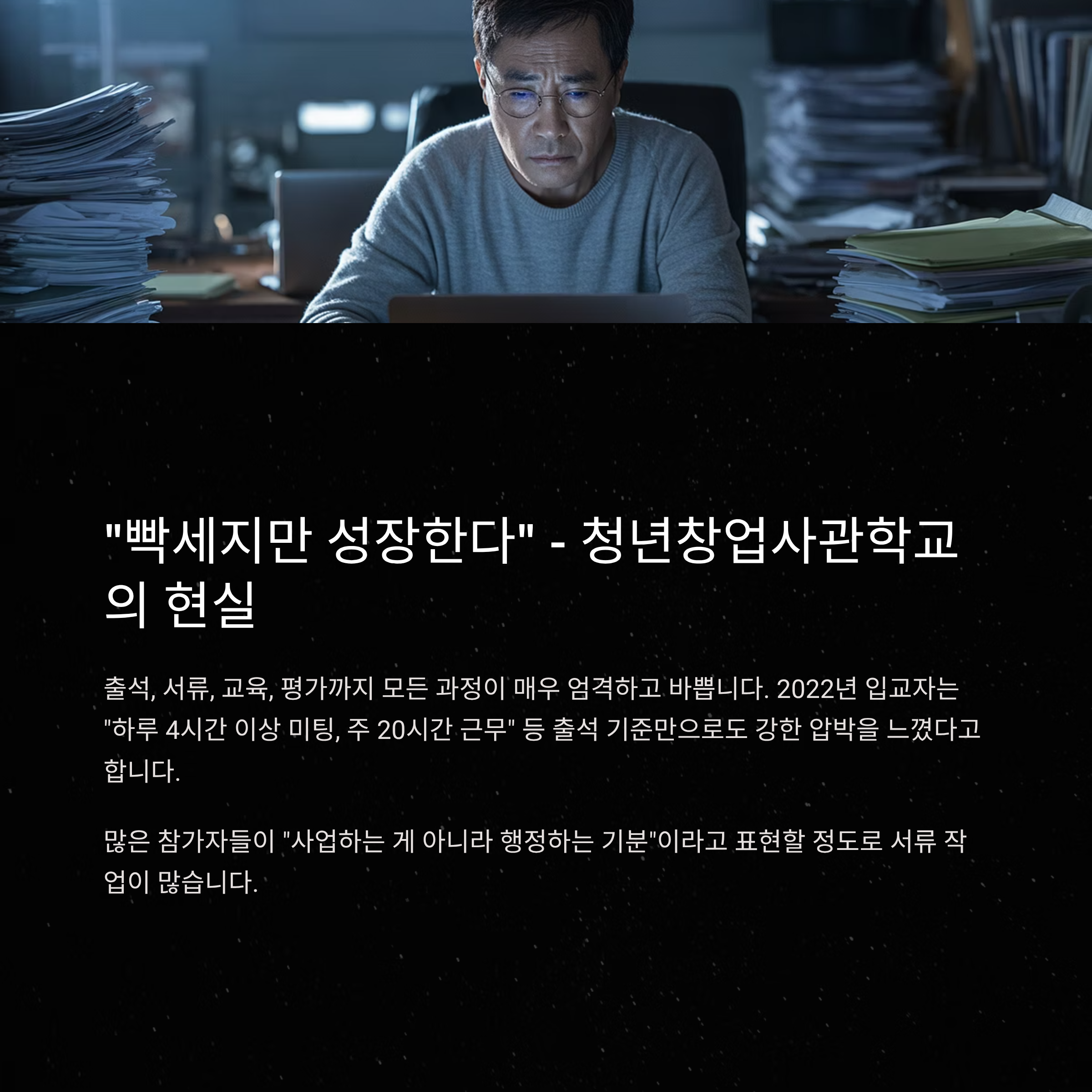 많은 후기에서 출석, 서류, 교육, 평가까지 모든 과정이 매우 엄격하고 바쁘다는 평이 많습니다. 2022년 입교자 중 한 분은 “입소 기준 하루 4시간 이상 미팅, 주 20시간 근무” 등 출석 기준에 맞추기만 해도 강한 압박이라고 합니다.([turn0search0])