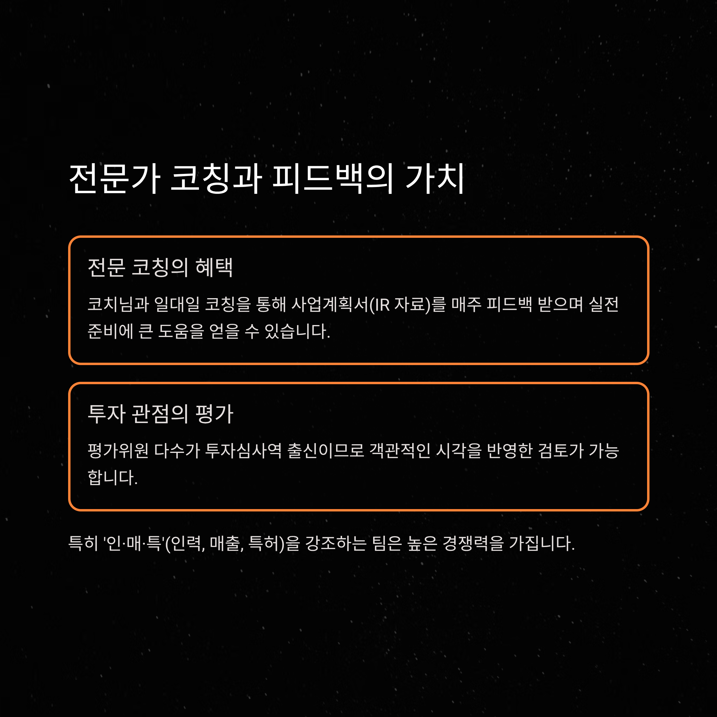 코치님과 일대일 코칭을 통해 사업계획서(IR 자료)를 매주 피드백 받는 것이 실전 준비에 큰 도움이 된다는 후기입니다. 평가위원 다수가 투자심사역 출신이므로 객관적인 시각을 반영한 검토가 가능해요.([turn0search15])