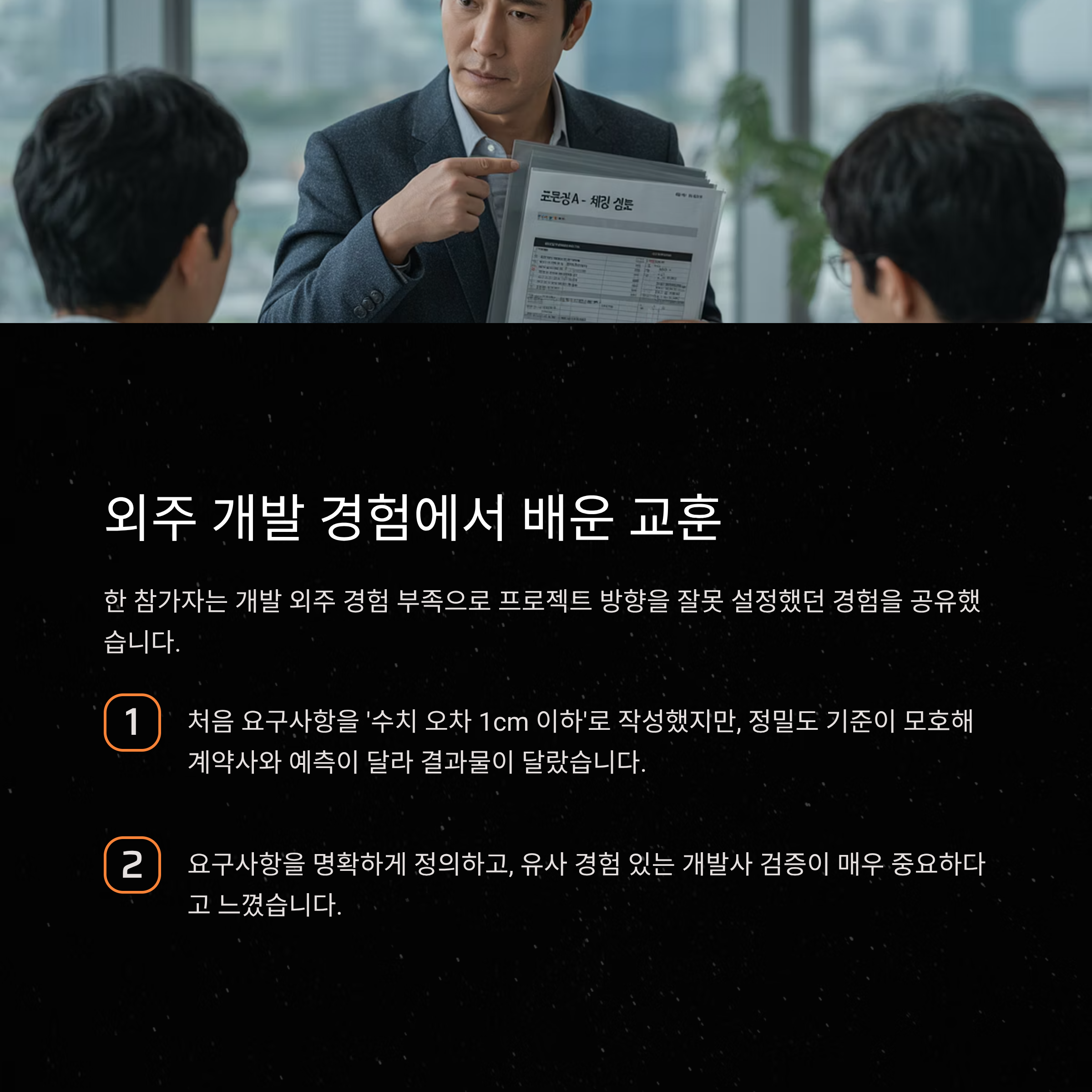 처음 요구사항을 ‘수치 오차 1cm 이하’로 작성했지만, 정밀도 기준이 모호해 계약사와 예측이 달라 결과물이 달랐다고 해요. 요구사항을 명확하게 정의하고, 유사 경험 있는 개발사 검증이 매우 중요하다고 느꼈다고 합니다.([turn0search17])