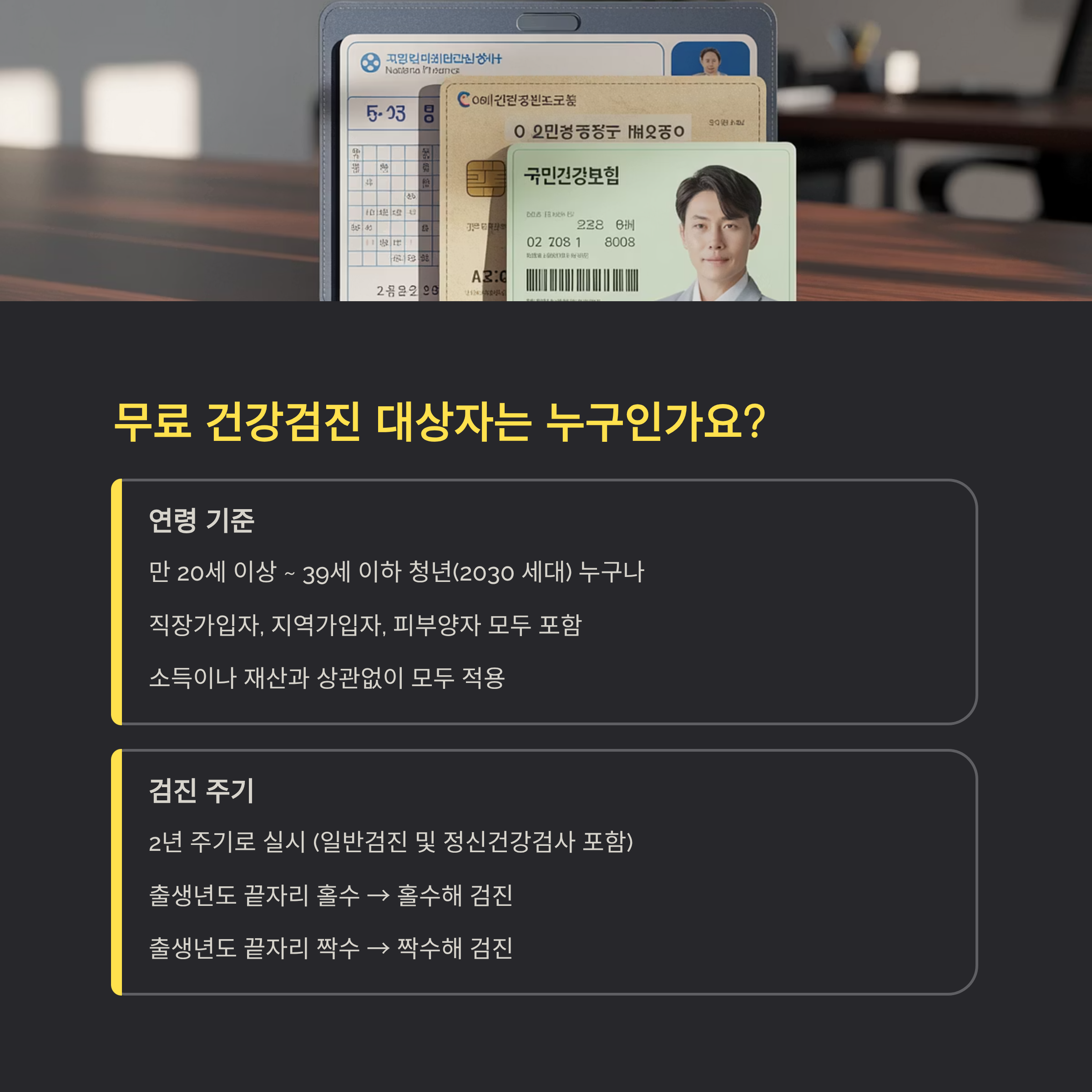 - **만 20세 이상 ~ 39세 이하 청년(2030 세대)**은 누구나 국가건강검진 무료 대상입니다.