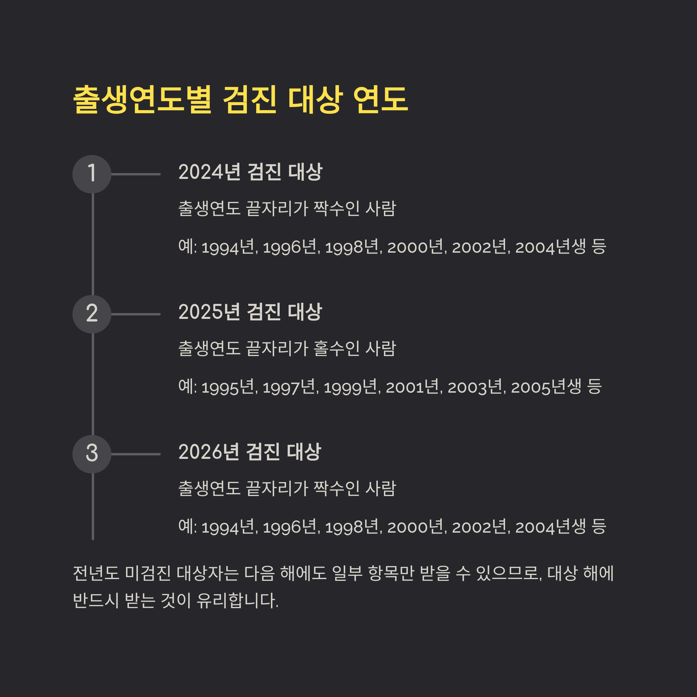 - 예: 2003년생(홀수 끝자리) → 2025년 검진 대상, 2002년생(짝수 끝자리) → 2026년 검진 대상 (열고닫기).