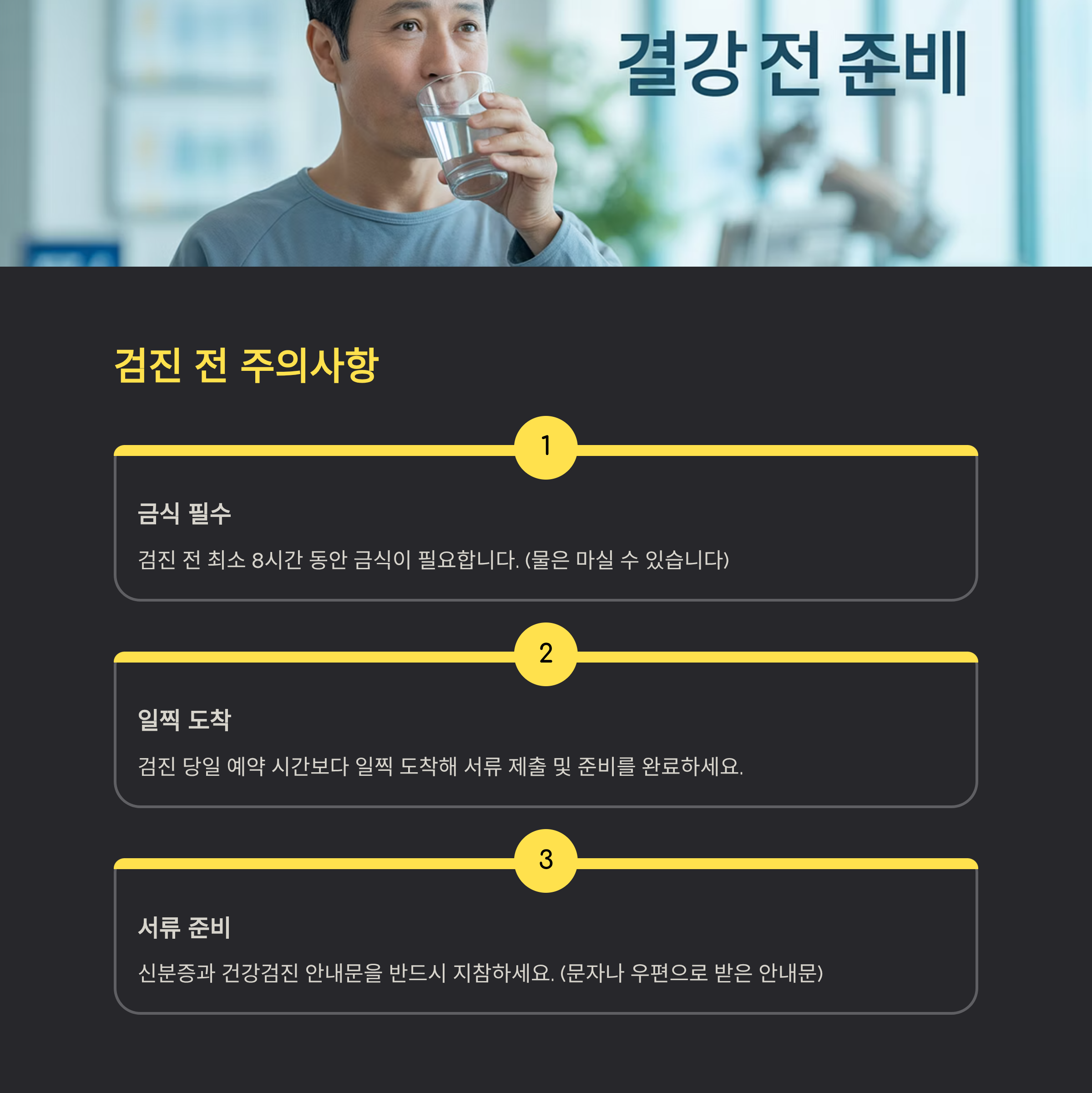 - 검진 전 8시간 금식 필요 (물은 가능)