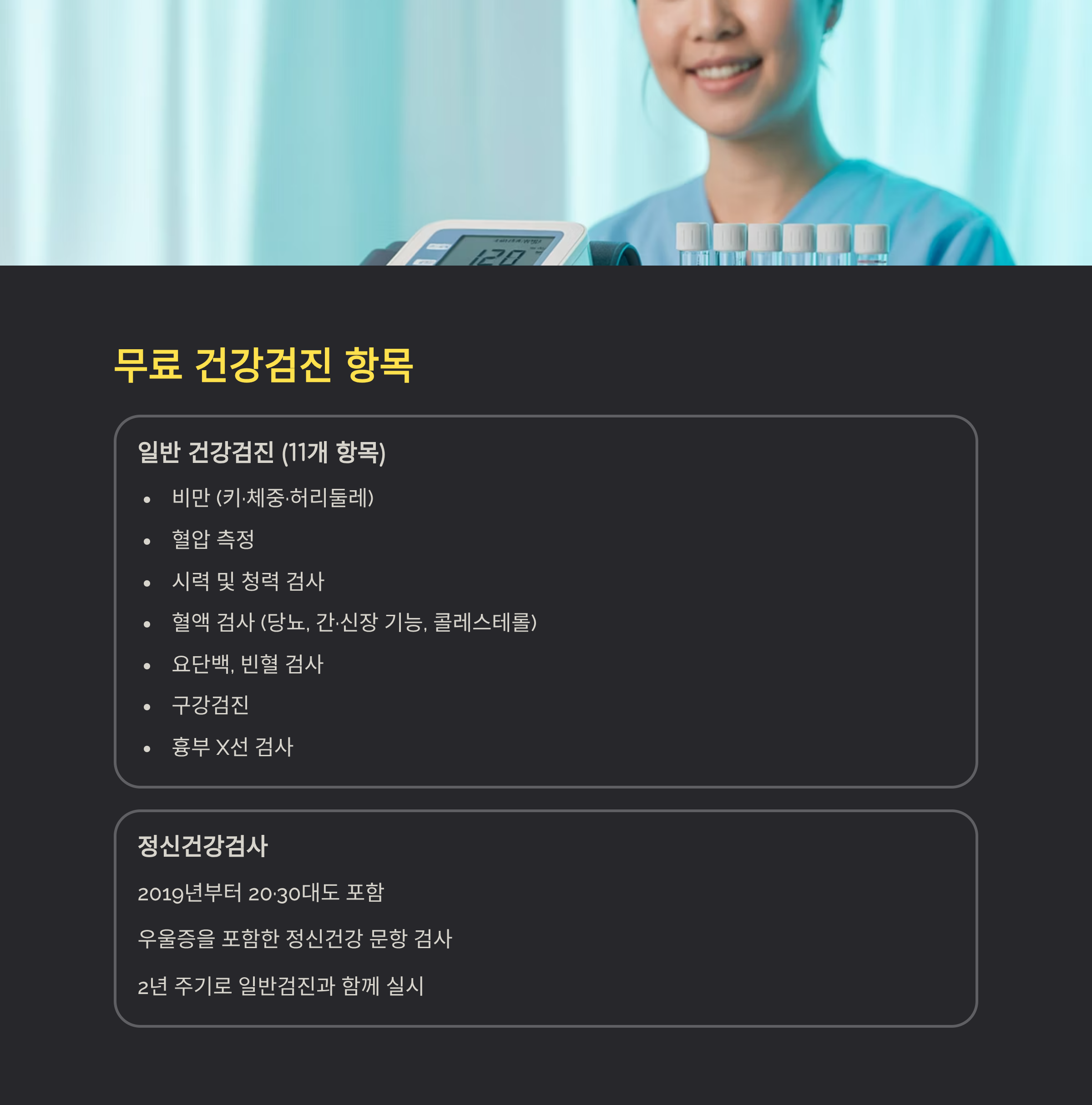 | 검진 항목 | 비만, 혈압, 당뇨, 콜레스테롤, 흉부 X-ray, 우울증 등 총 11개 |