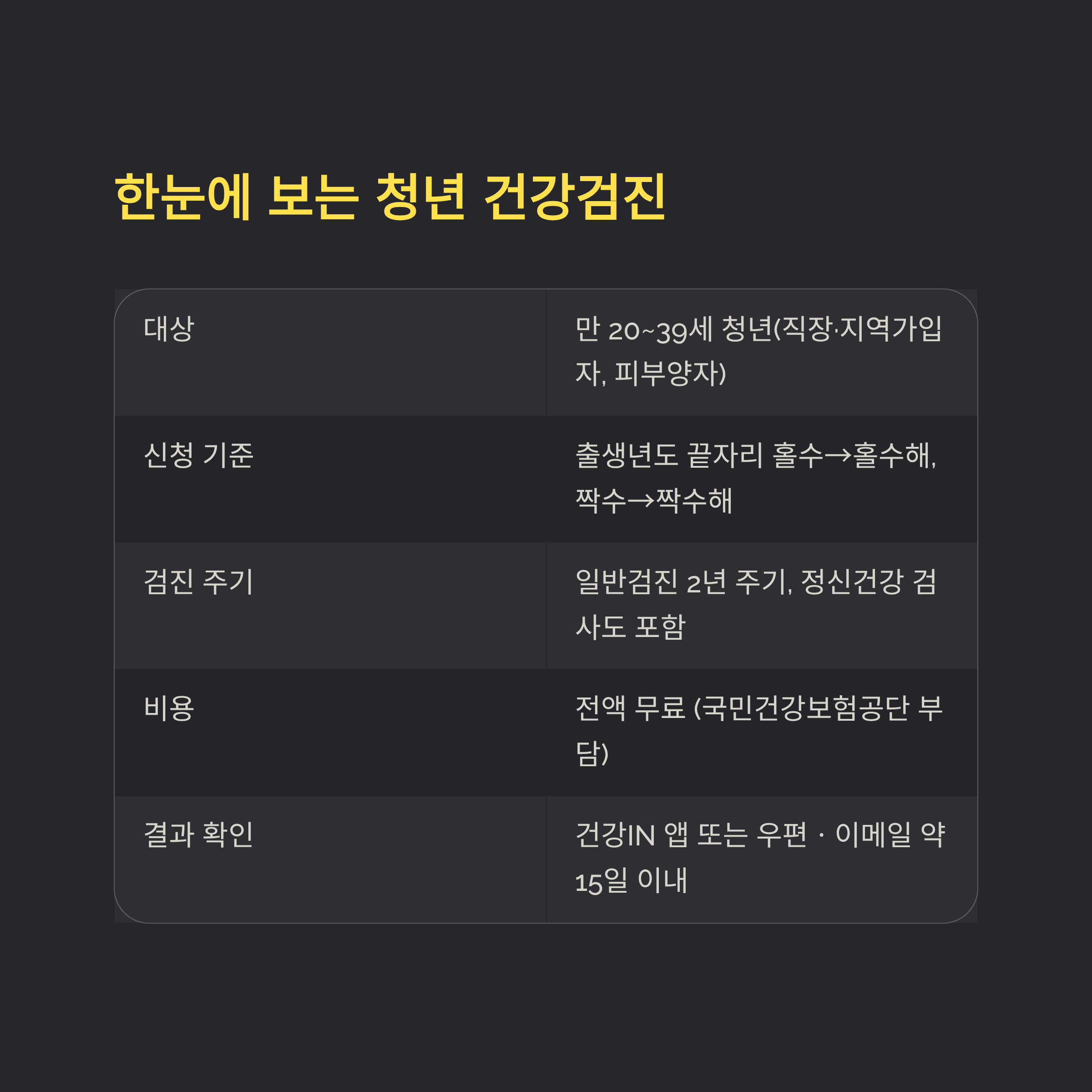| 대상 | 만 20~39세 청년(직장·지역가입자, 피부양자) |