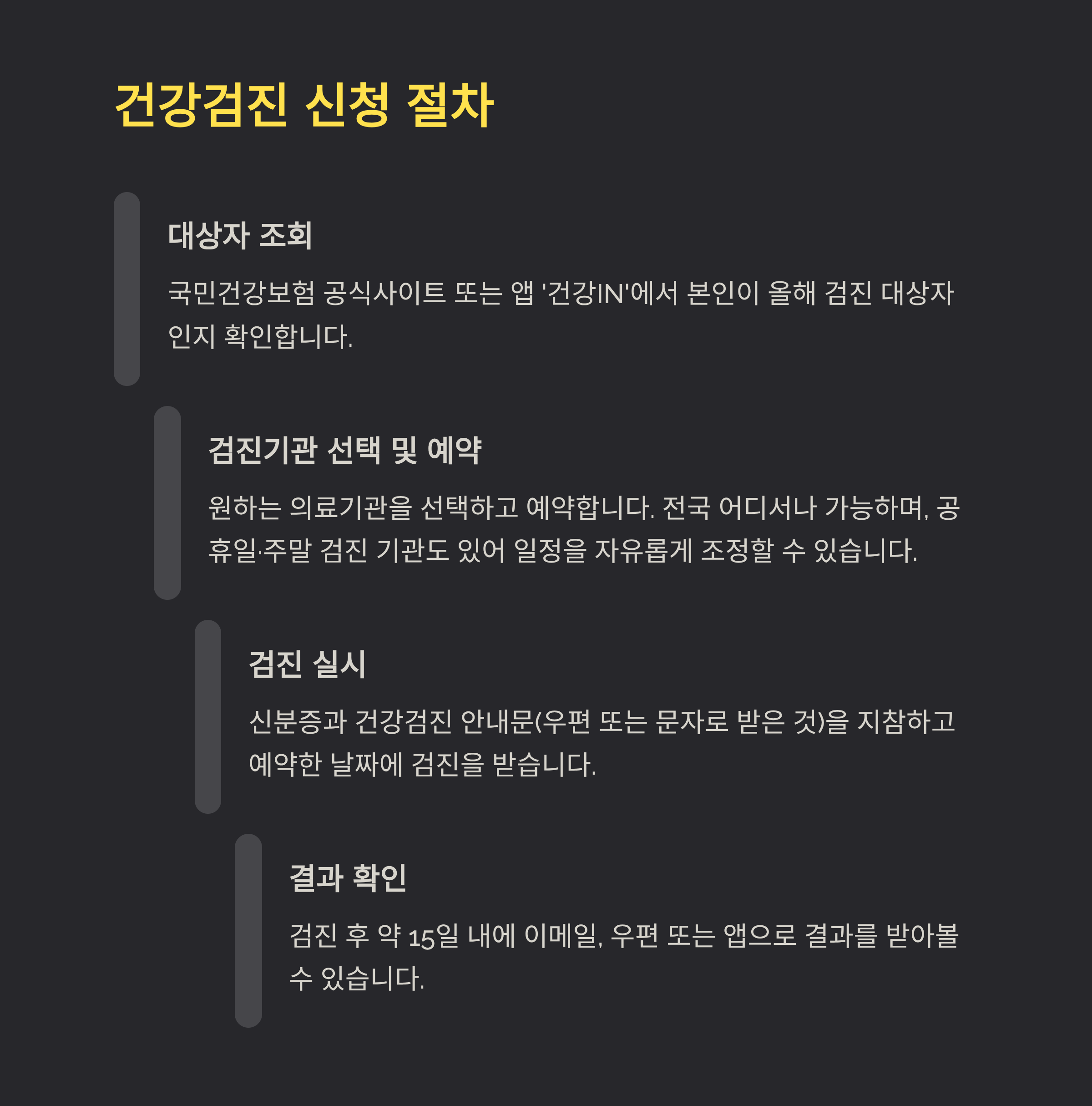 | 결과 확인 | 건강IN 앱 또는 우편ㆍ이메일 약 15일 이내 |