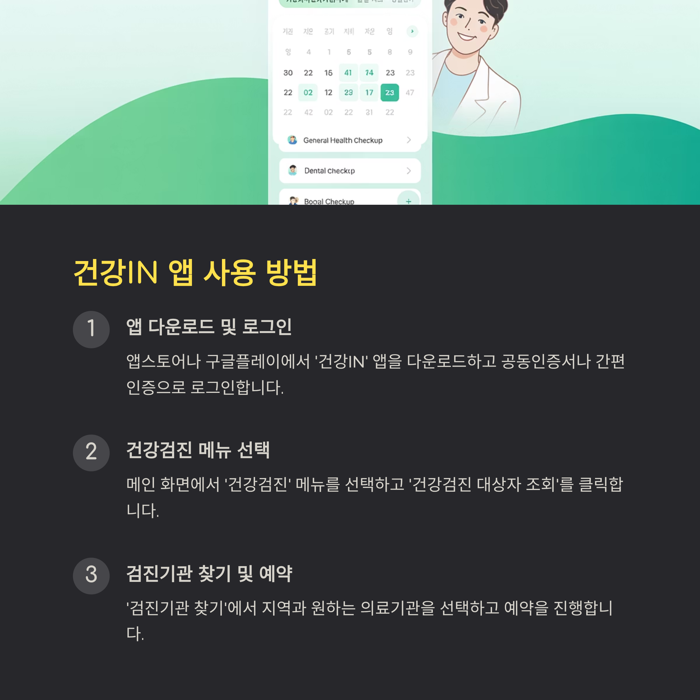 - 검진기관 찾기 → 원하는 의료기관 선택 및 예약