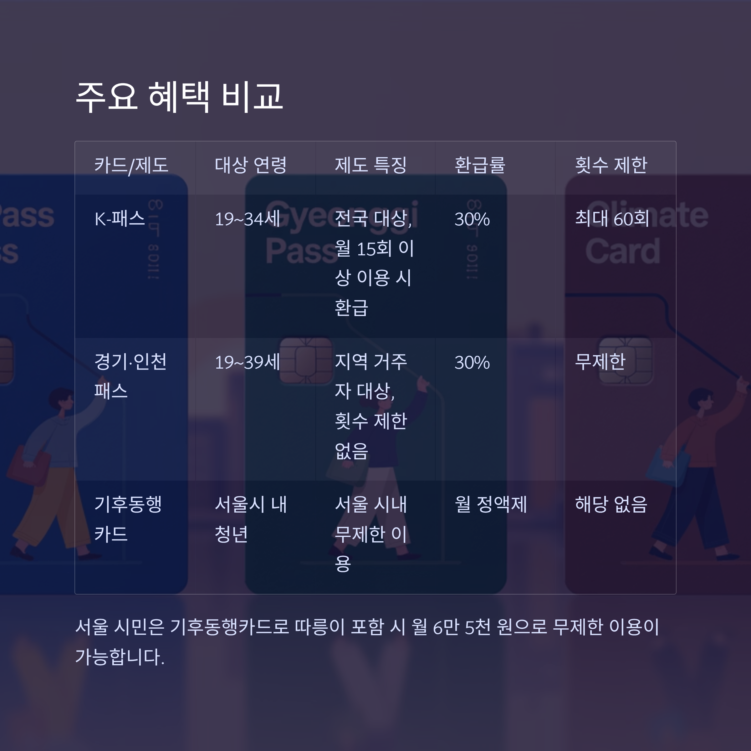 | 기후동행카드 | 서울시 내 청년 | 서울 시내 무제한 이용 월 정액제 (따릉이 포함 6.5만 원) | 실질 비용 절감 | 해당 없음 |