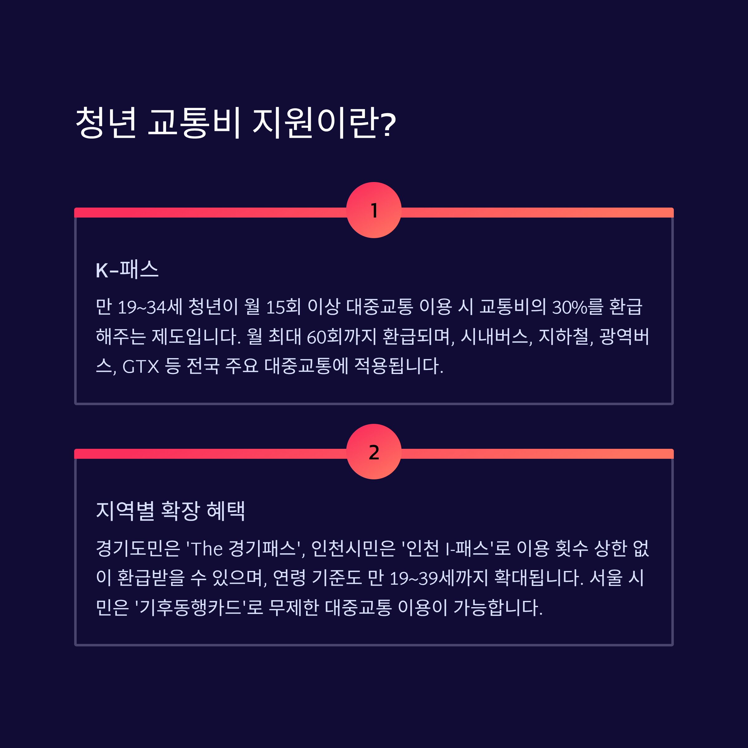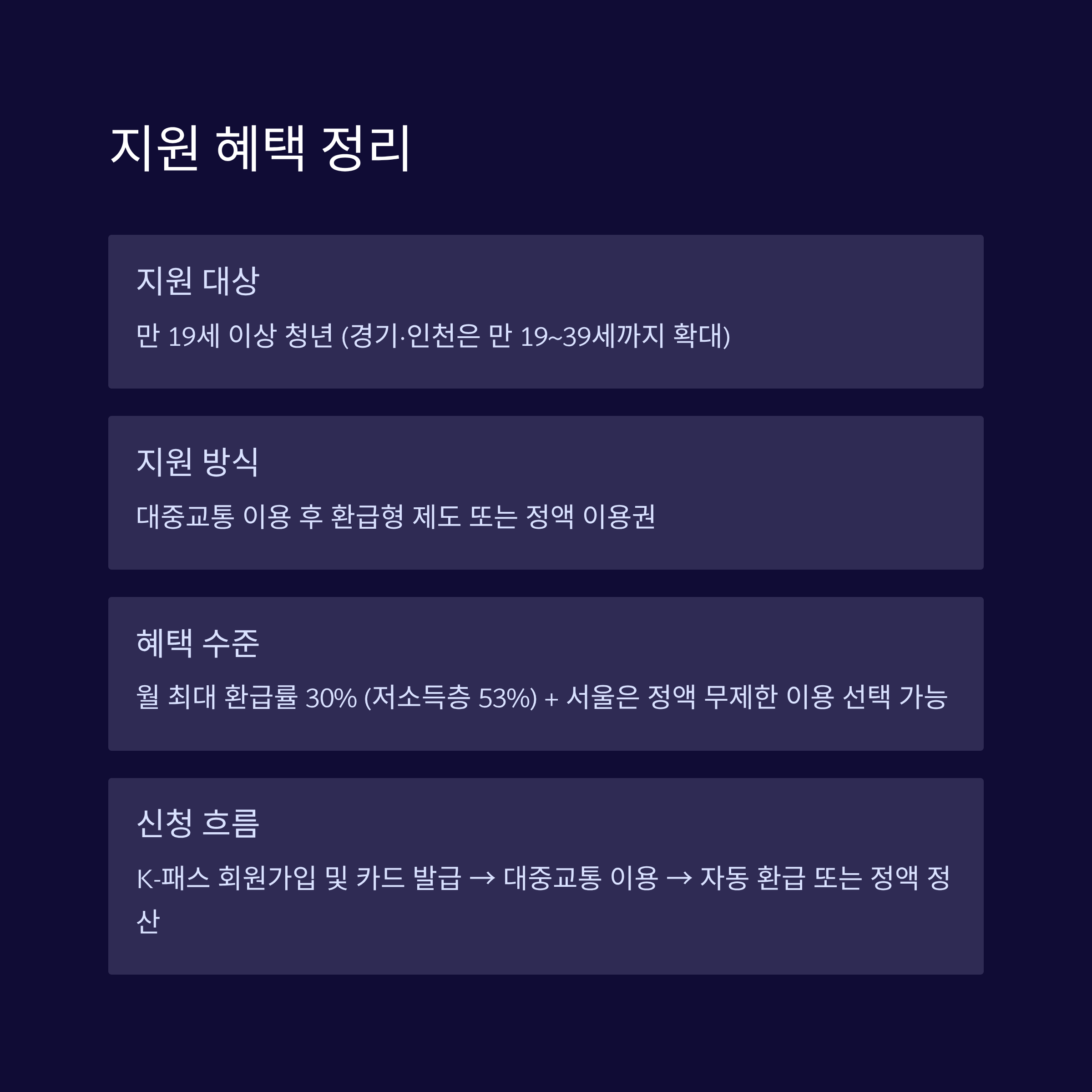 | K‑패스 | 19~34세 청년 | 전국 대상, 월 15회 이상 이용 시 환급 | 청년 30% | 최대 60회 |
