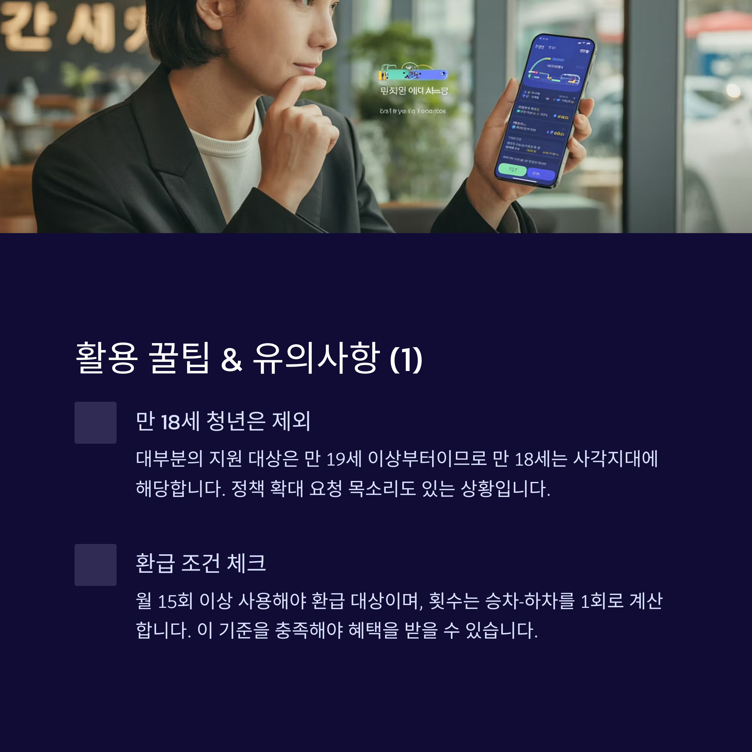 - 환급 조건 체크: 월 15회 이상 사용해야 환급 대상이며, 횟수는 승차‑하차를 1회로 계산합니다.([turn0search7][turn0search8])