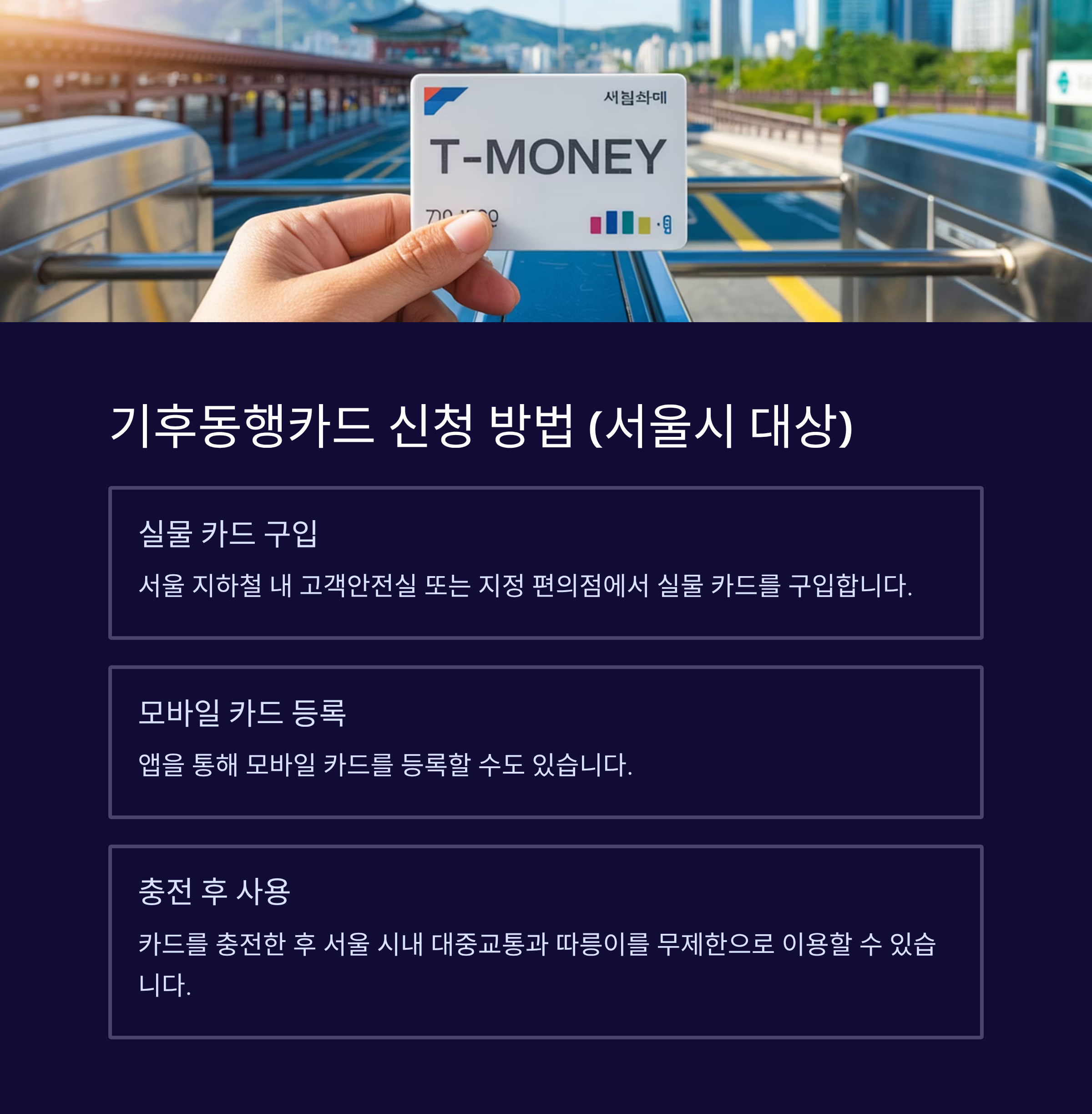 서울 지하철내 고객안전실 또는 지정 편의점에서 실물 카드 구입 또는 앱으로 모바일 카드 등록 → 충전 후 사용 시작 ([turn0search3][turn0search9]) - 월 15회 이상 대중교통 이용 후 자동 환급 시스템으로 정산 → 카드 유형에 따라 체크카드 통장 환급, 청구할인 등 방식 제공 ([turn0search7][turn0search14])