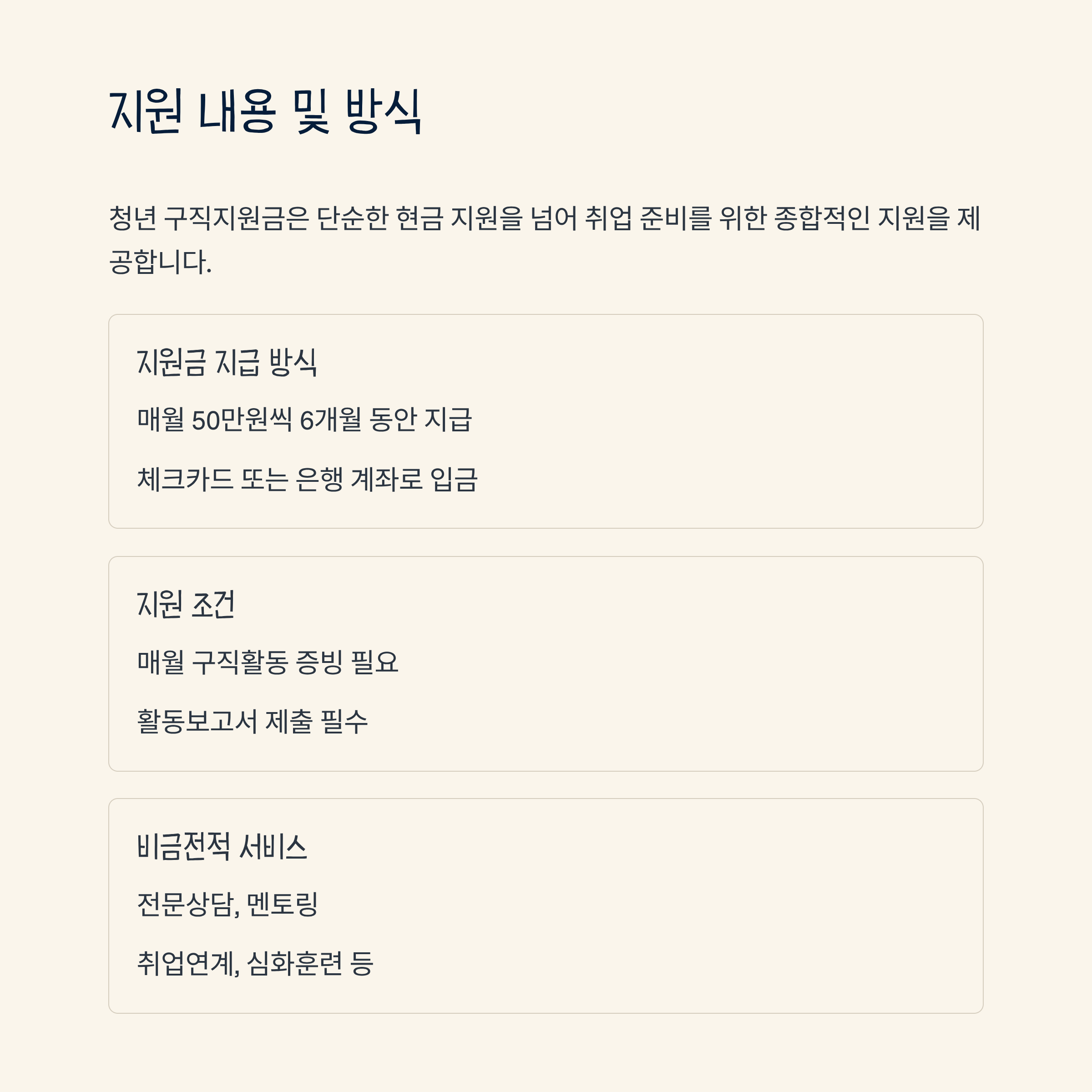 체크카드 또는 은행 계좌로 지급되며, 구직활동용도 확인 후 입금 방식이 일반적입니다. - 지원 조건