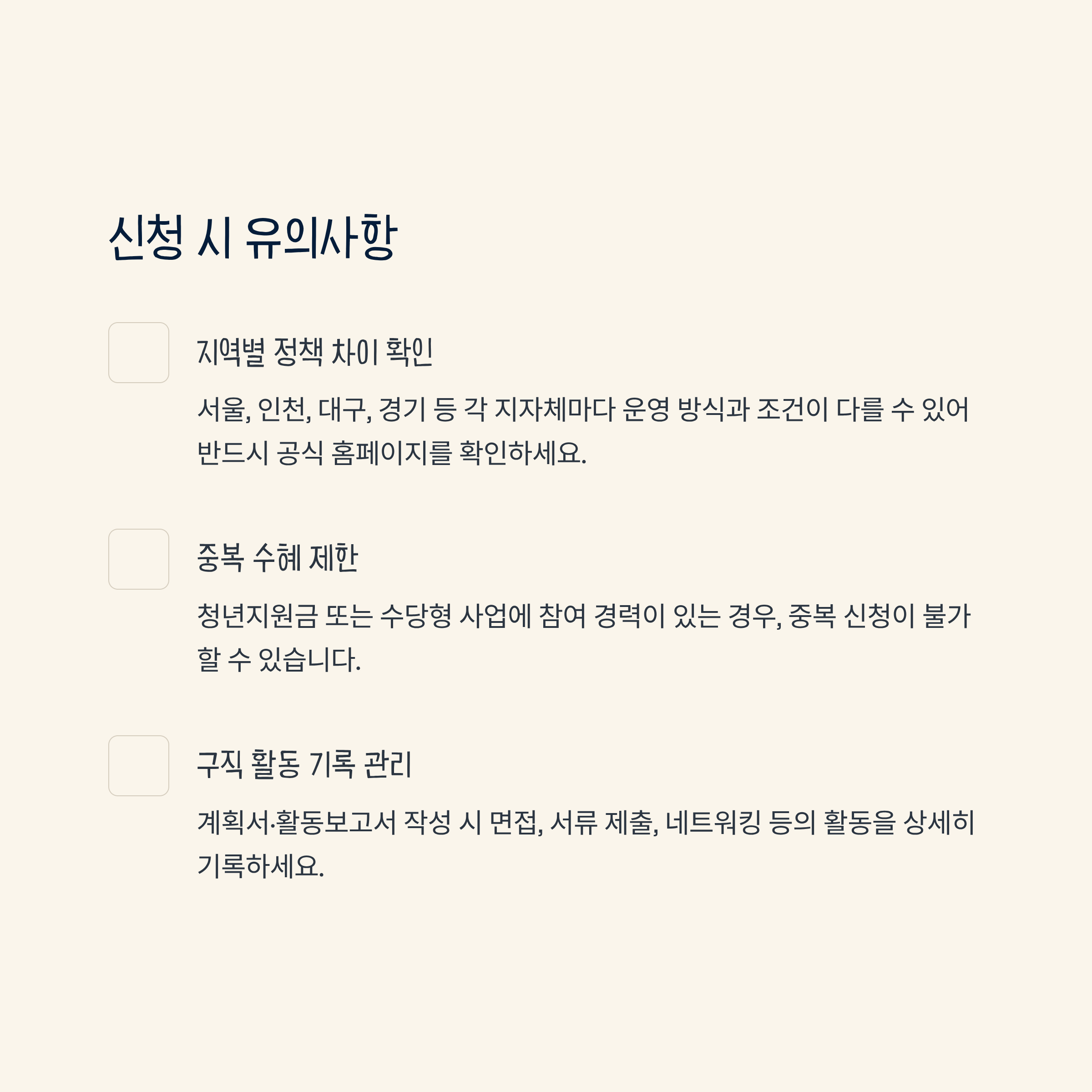 - 주의사항: 지역 정책별 차이 확인, 구직활동 증빙 필수, 중복 수혜 불가