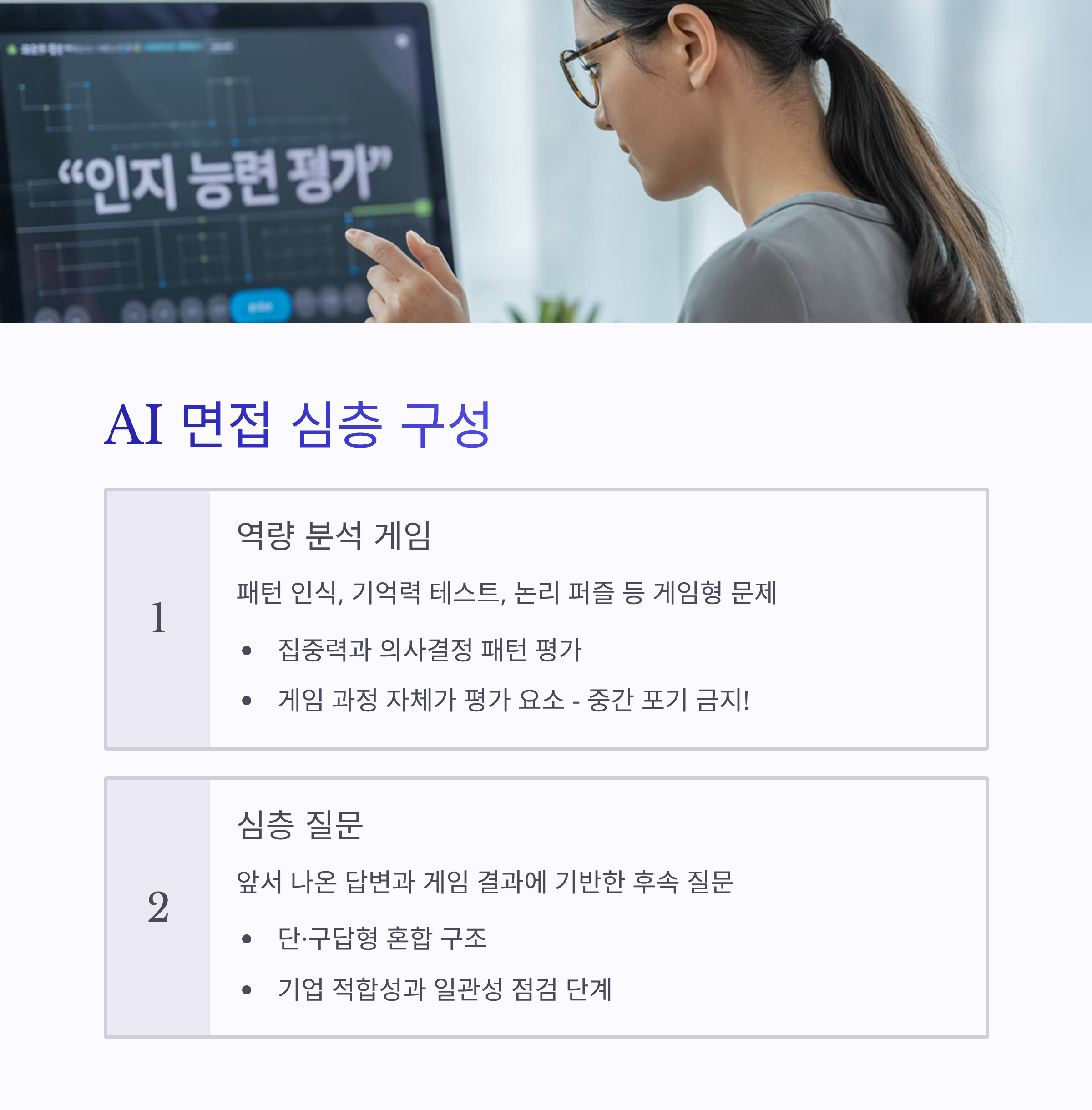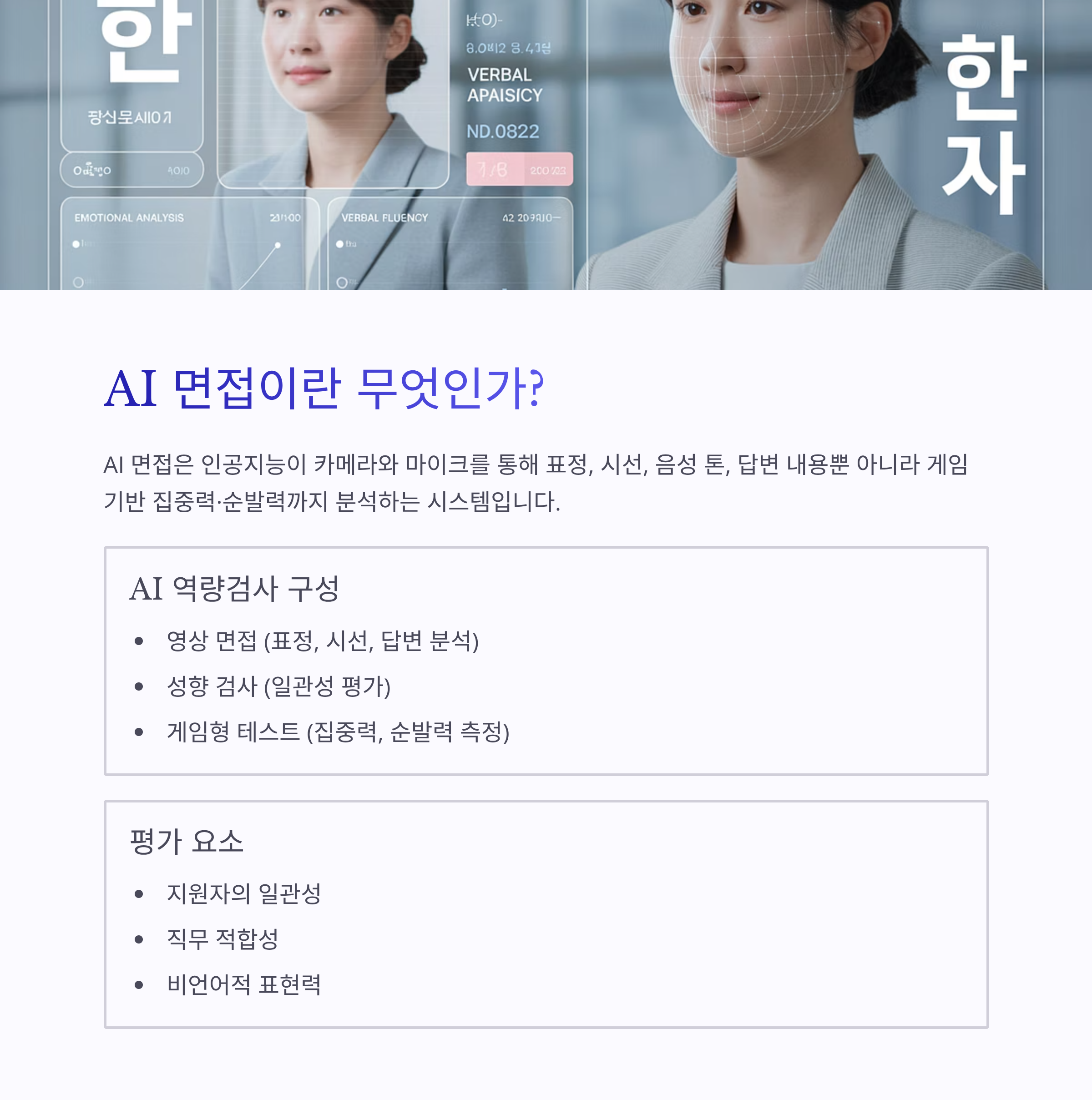 AI 면접은 인공지능이 카메라와 마이크를 통해 표정, 시선, 음성 톤, 답변 내용뿐 아니라 게임 기반 집중력·순발력까지 분석하는 시스템입니다.