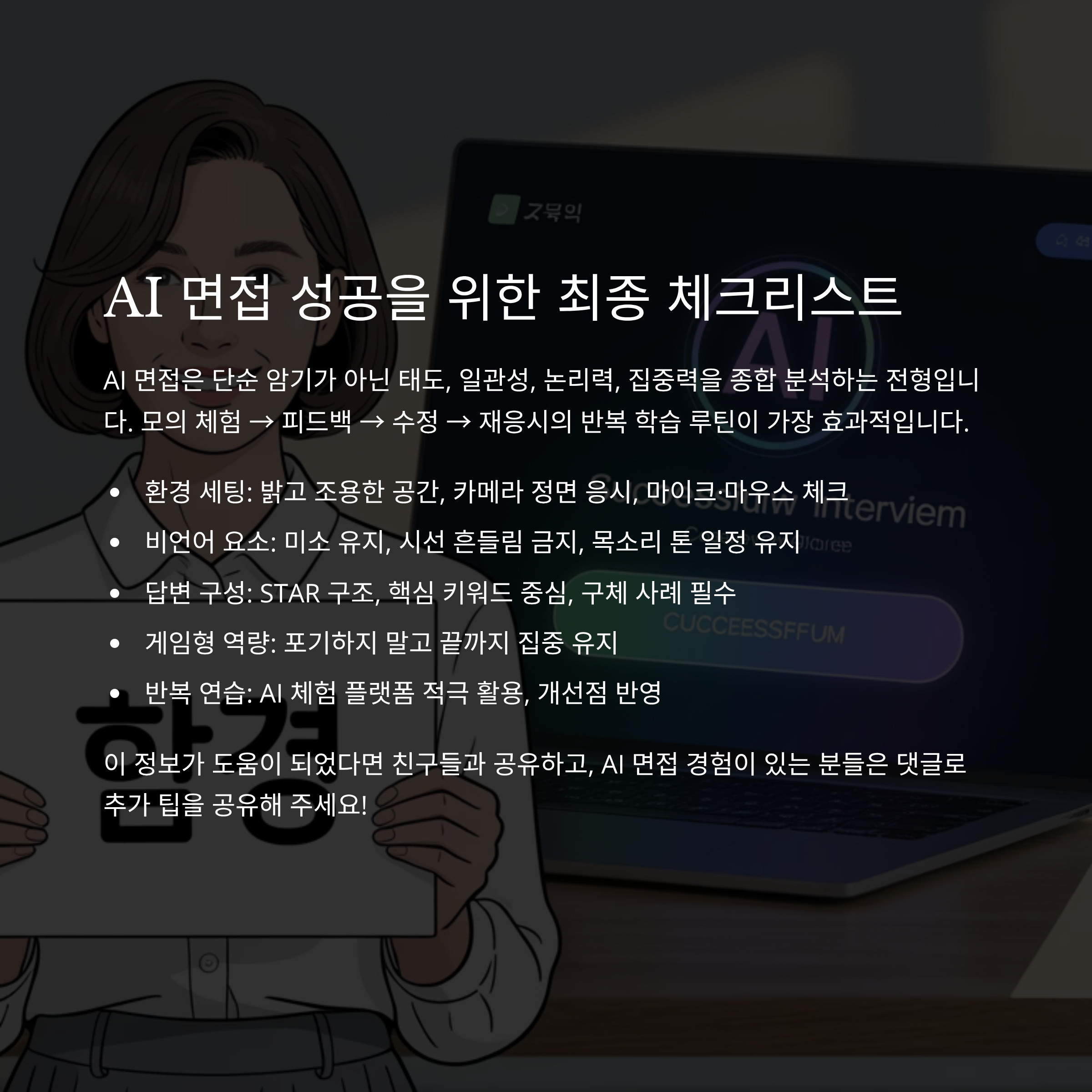 무료 AI 면접 체험 프로그램도 적극 활용해서, 기술적인 환경과 콘텐츠 준비를 완벽히 갖춘다면 좋은 결과가 따라올 거예요!