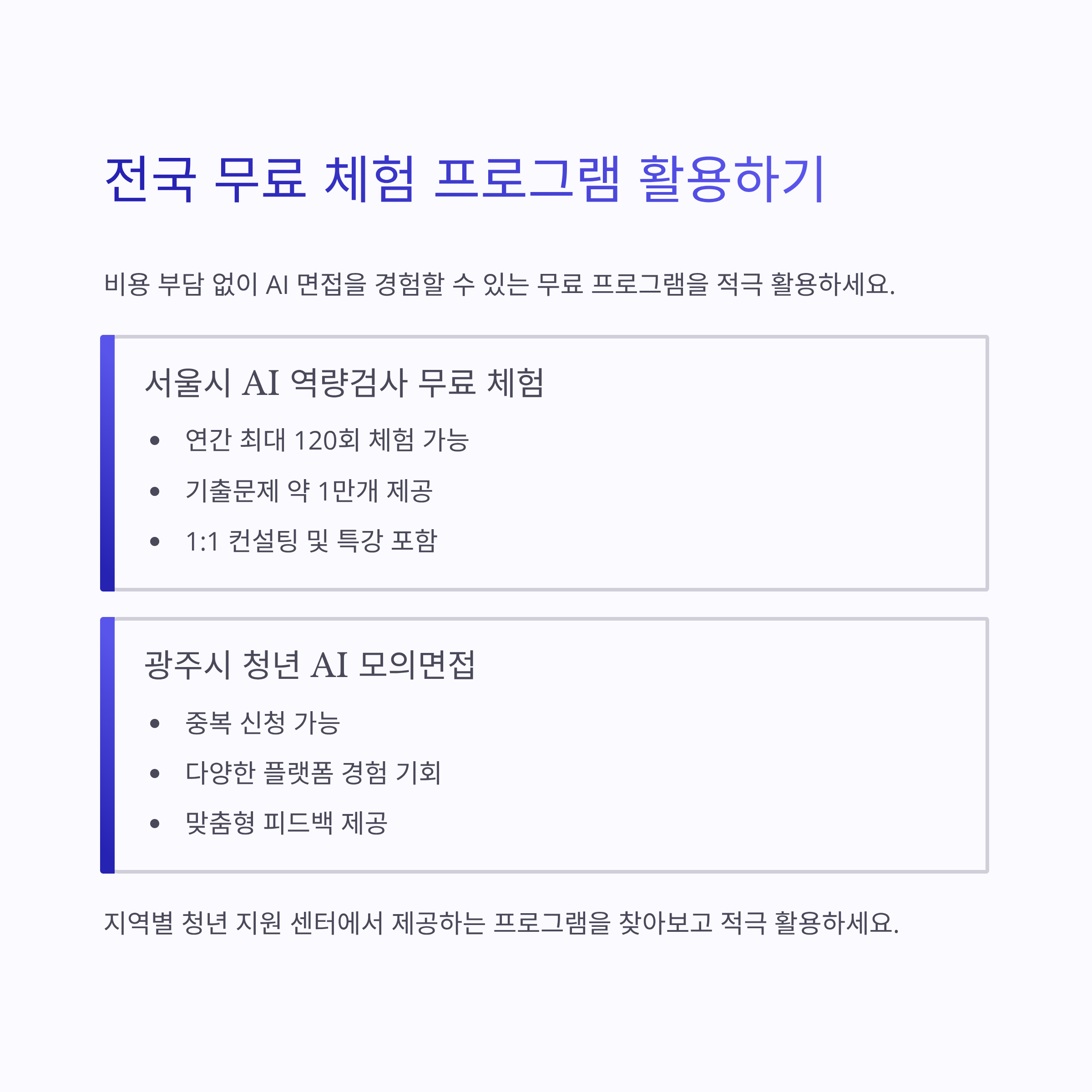 - 서울시 AI 역량검사 무료 체험: AI 면접·게임·성향검사 연간 최대 120회 체험 가능, 기출문제 약 1만개 제공, 1:1 컨설팅 및 특강 포함 (서울 열린 정부).