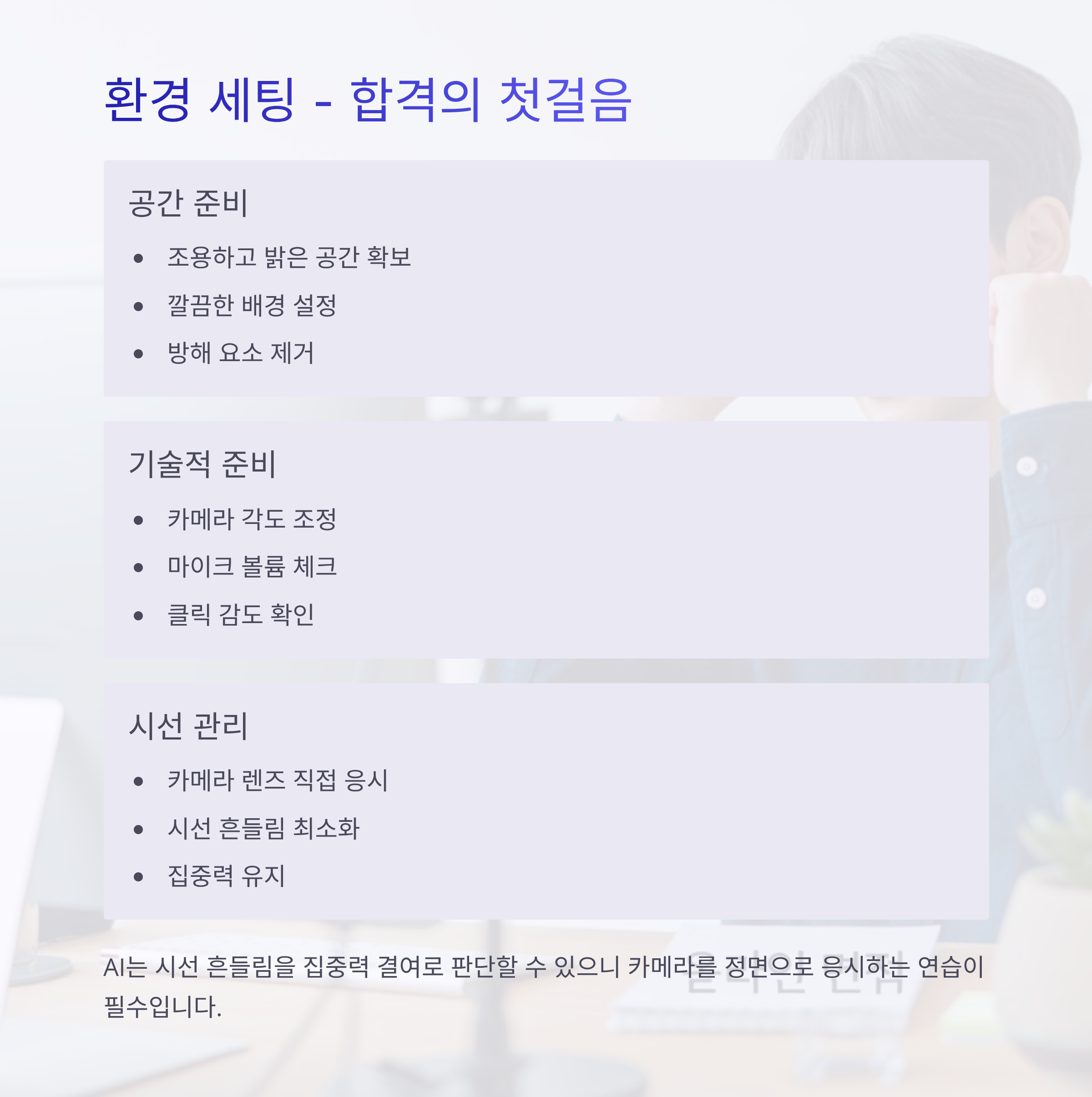 | 환경 세팅 | 밝고 조용한 공간, 카메라 정면 응시, 마이크·마우스 체크 |
