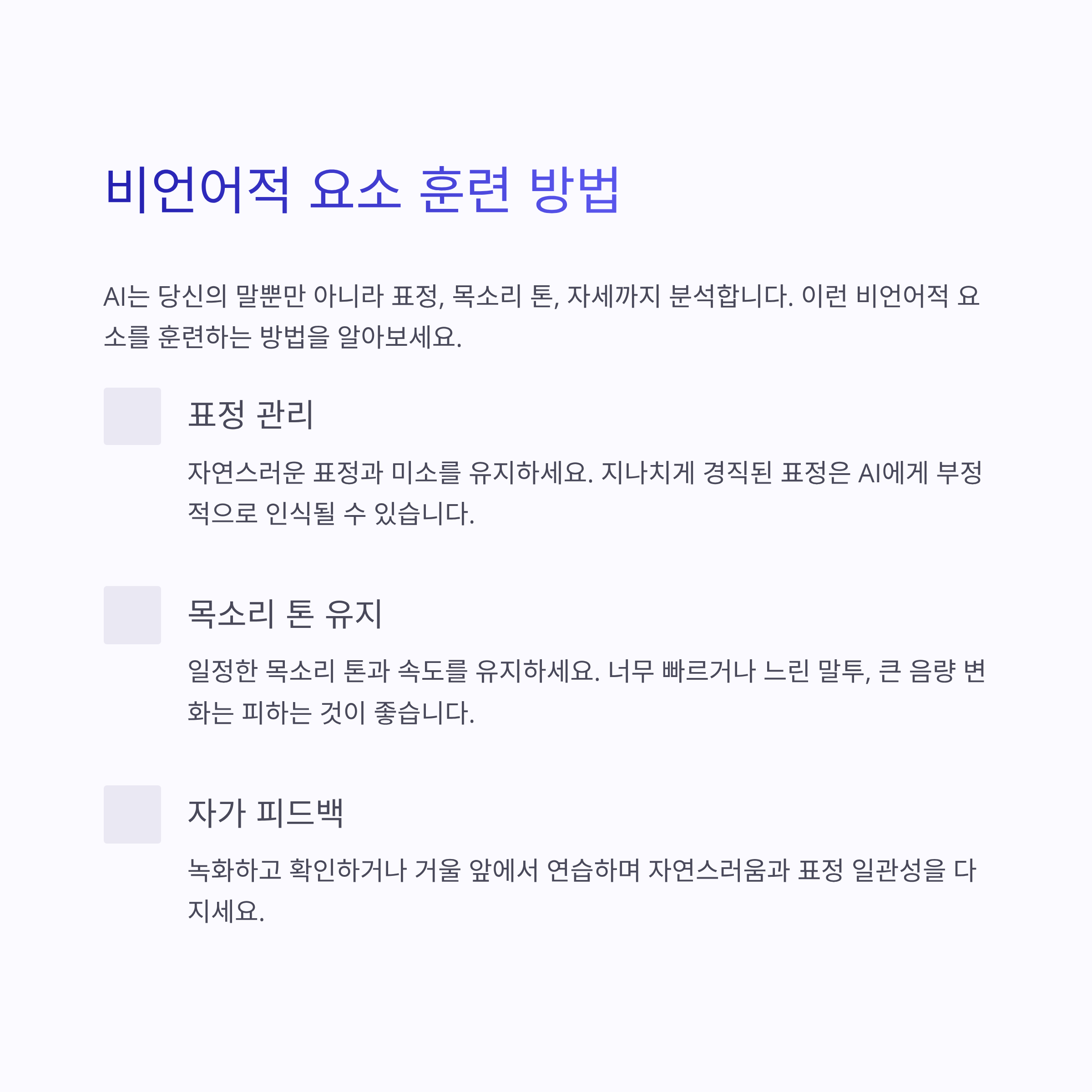 | 비언어 요소 | 미소 유지, 시선 흔들림 금지, 목소리 톤 일정 유지 |