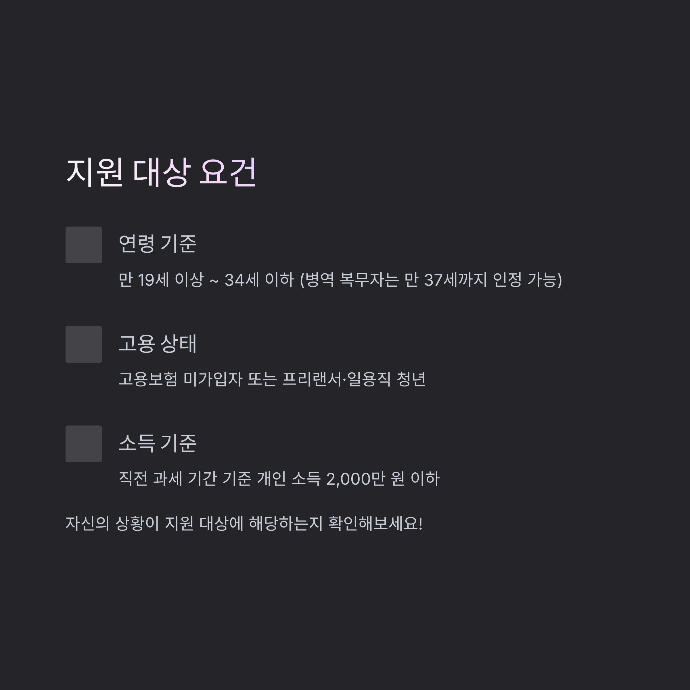 - 고용상태: 고용보험 미가입자 또는 프리랜서·일용직 청년