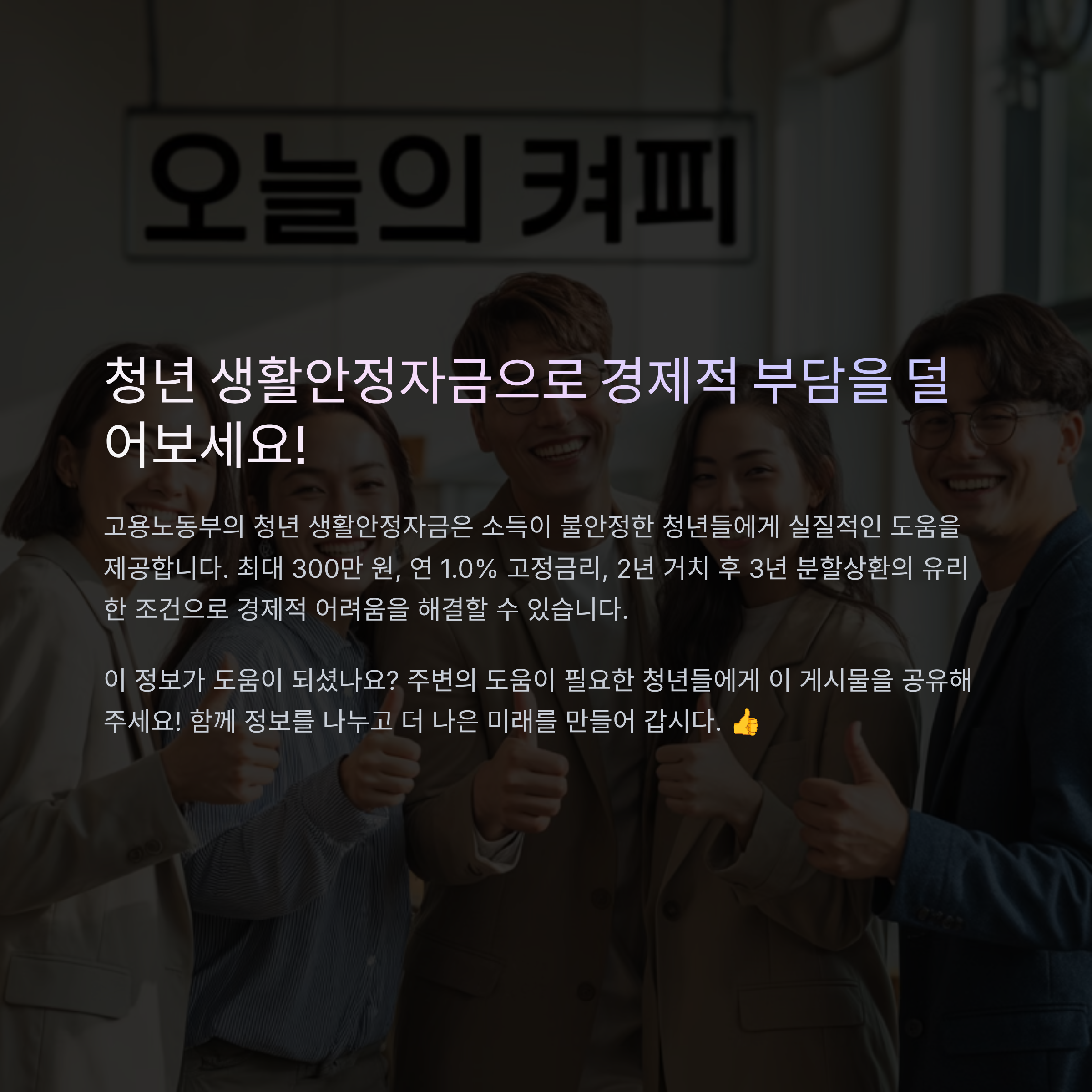 청년 생활안정자금은 급한 생활비·교육비 등 단기 자금이 필요할 때, 부담 적은 이자율로 빠르게 자금을 마련할 수 있는 실질적인 방법입니다.