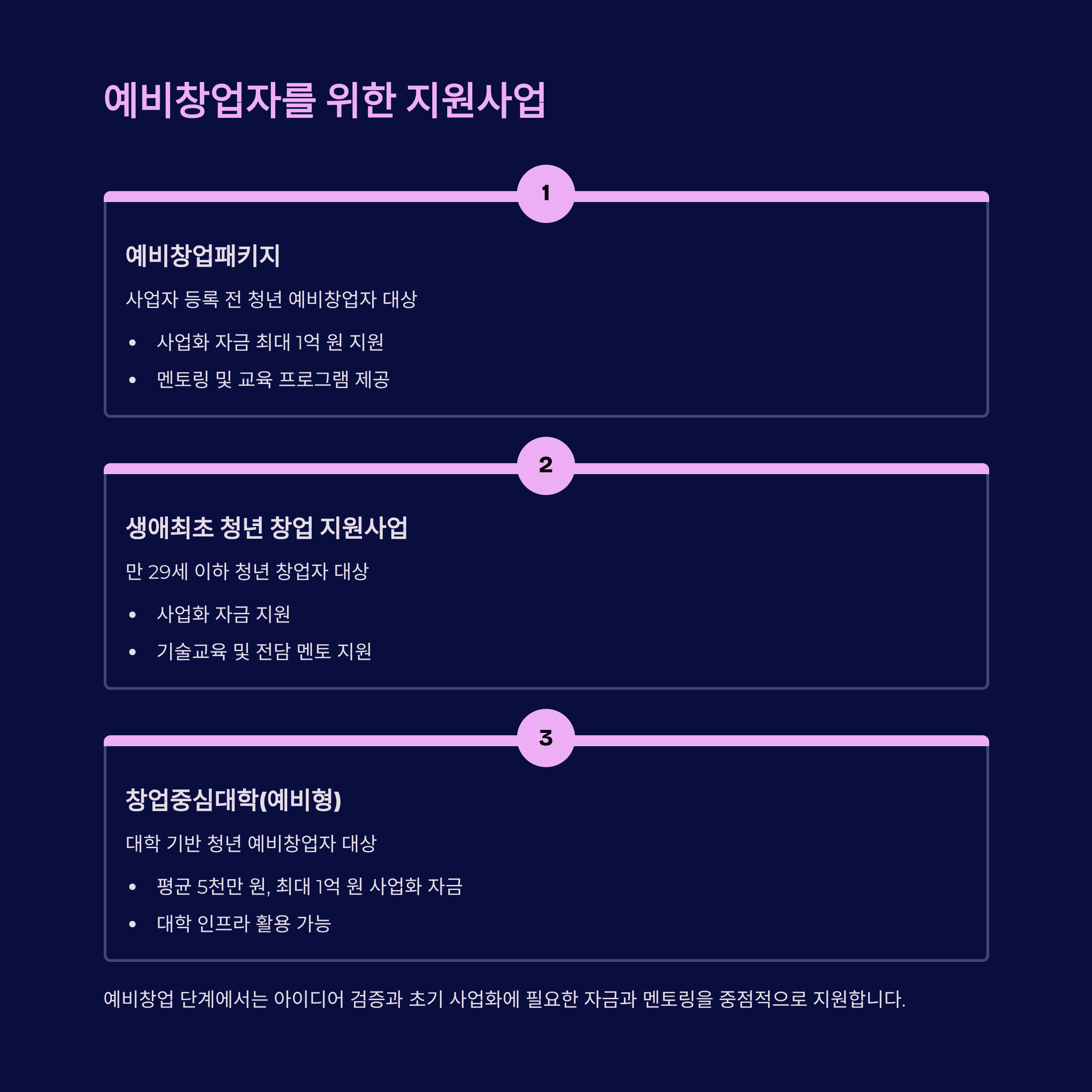 - 예비 창업자는 예비창업패키지, 생애최초 창업형, 대학 중심 창업 지원으로 시작