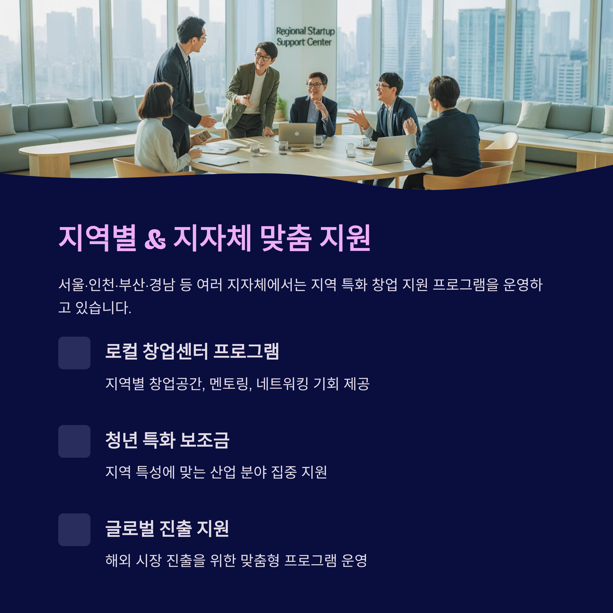 - 서울·인천·부산·경남 등 여러 지자체에서는 로컬 창업센터 프로그램(창업공간, 멘토링 등), 청년 특화 보조금 지원, 글로벌 진출 지원사업 등을 운영합니다 (pinepat.com).