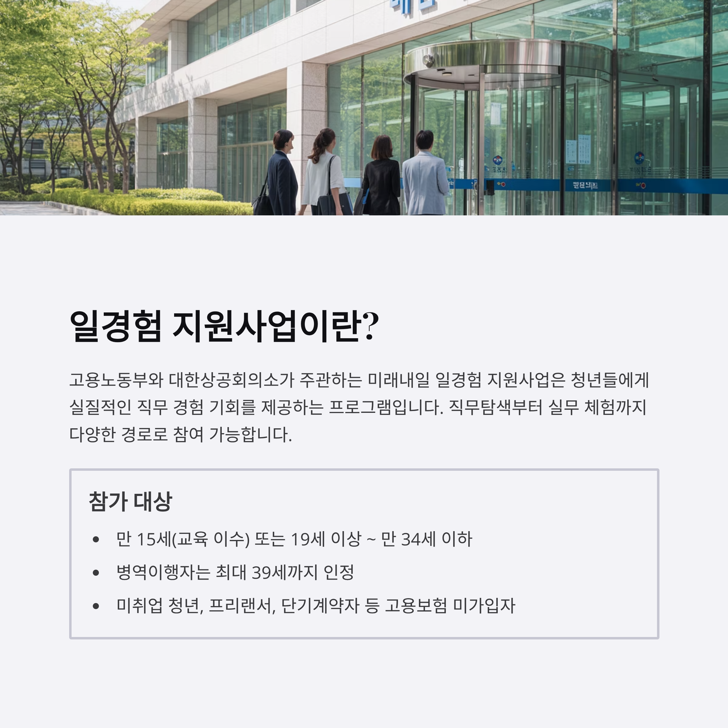 고용노동부와 대한상공회의소가 주관하는 미래내일 일경험 지원사업은 청년들에게 실질적 직무 경험 기회를 제공하는 프로그램입니다.
