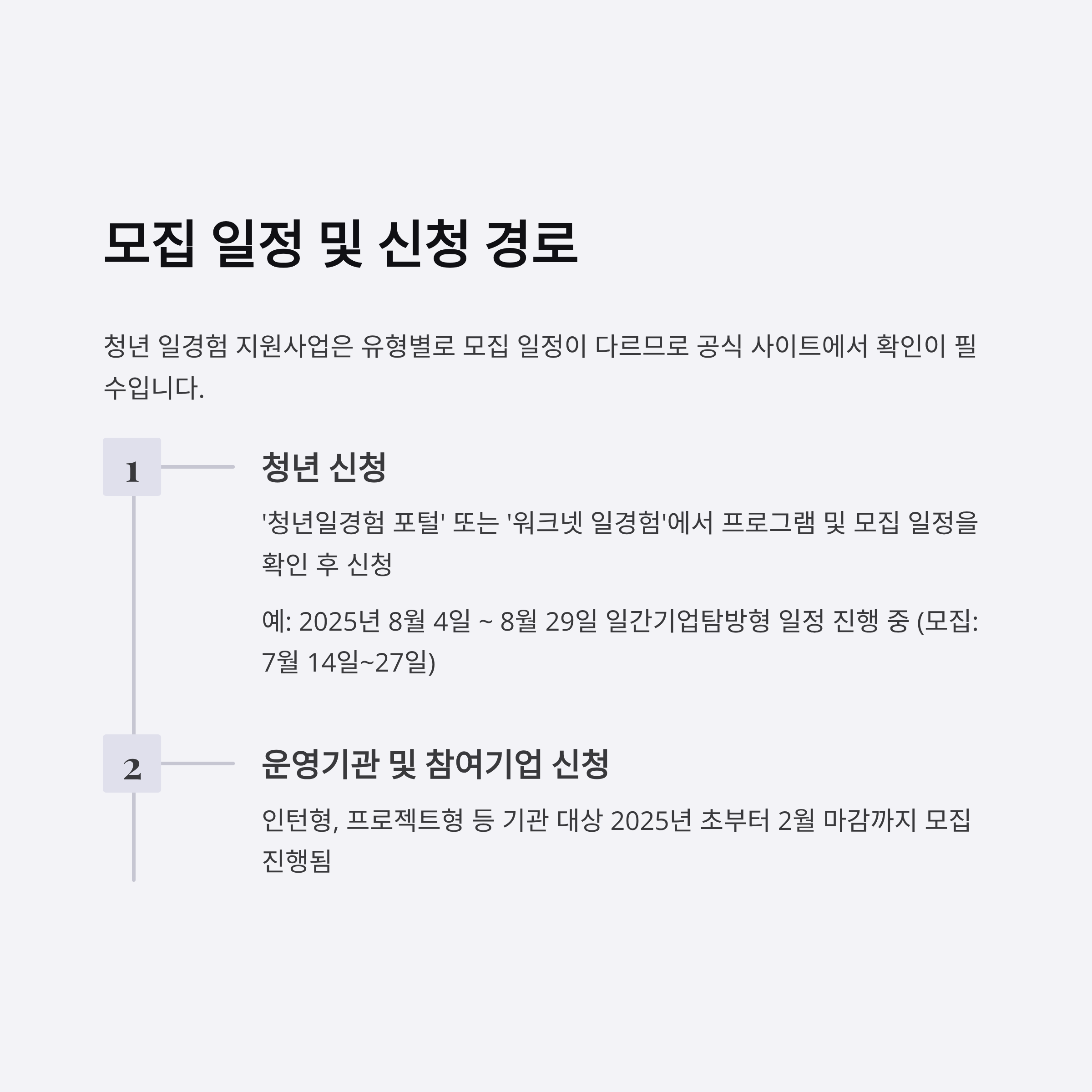 - 청년 신청: '청년일경험 포털' 또는 '워크넷 일경험'에서 프로그램 및 모집 일정을 확인 후 신청 (yw.work24.go.kr)