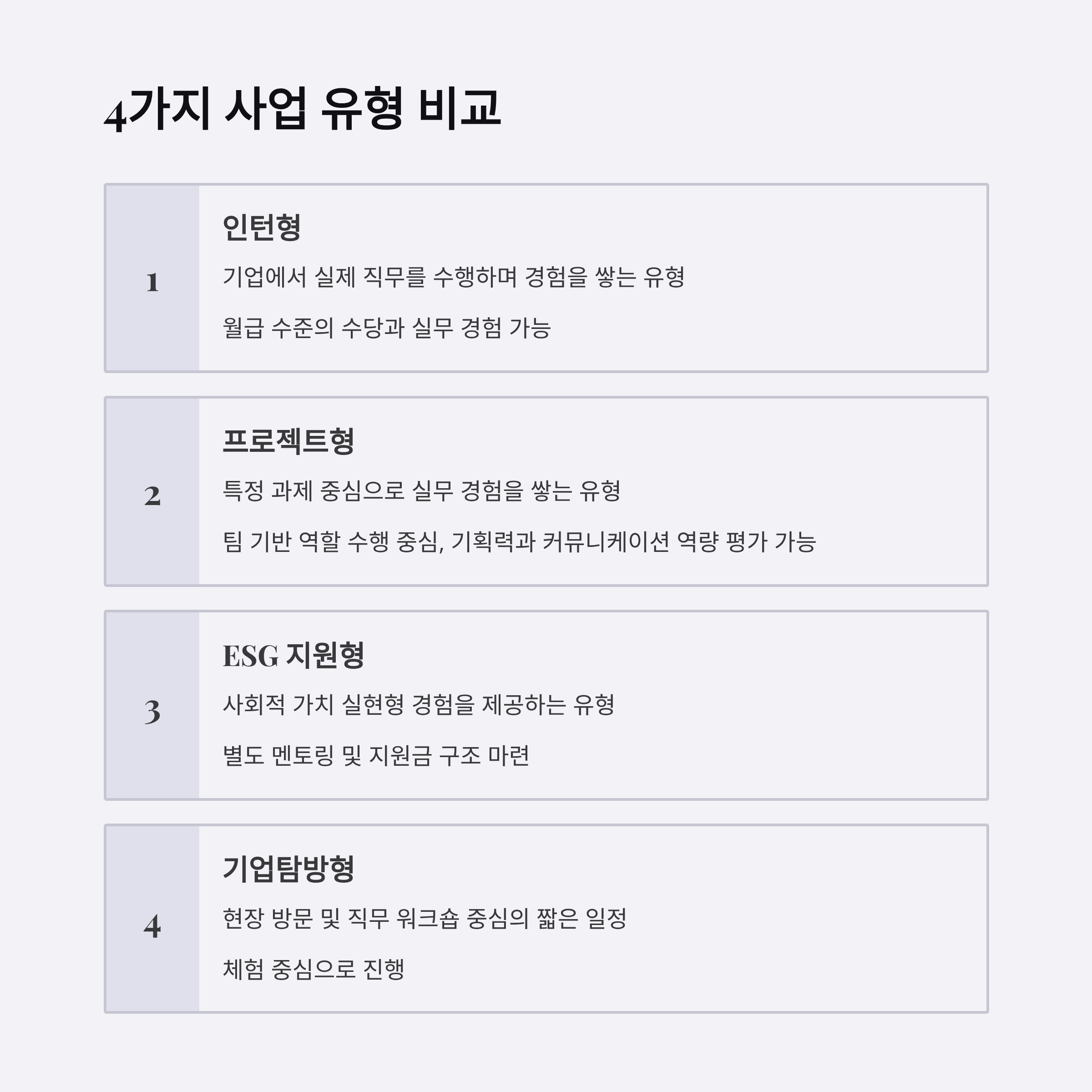 | 사업 유형 | 인턴형 / 프로젝트형 / ESG지원형 / 탐방형 |