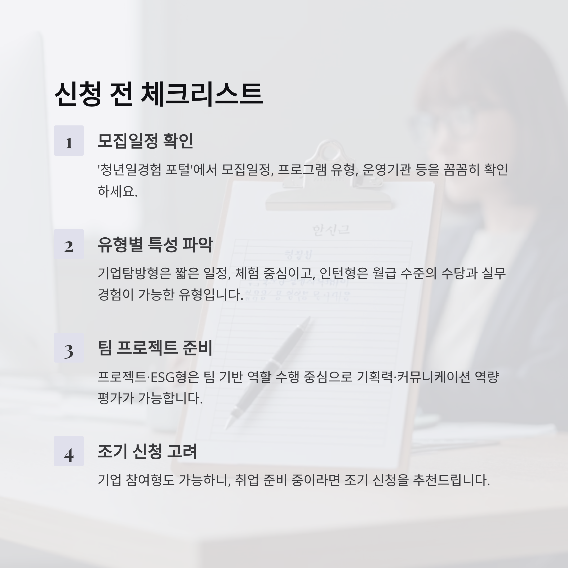 - 신청 전 ‘청년일경험 포털’에서 모집일정, 프로그램 유형, 운영기관 등을 꼼꼼히 확인하세요