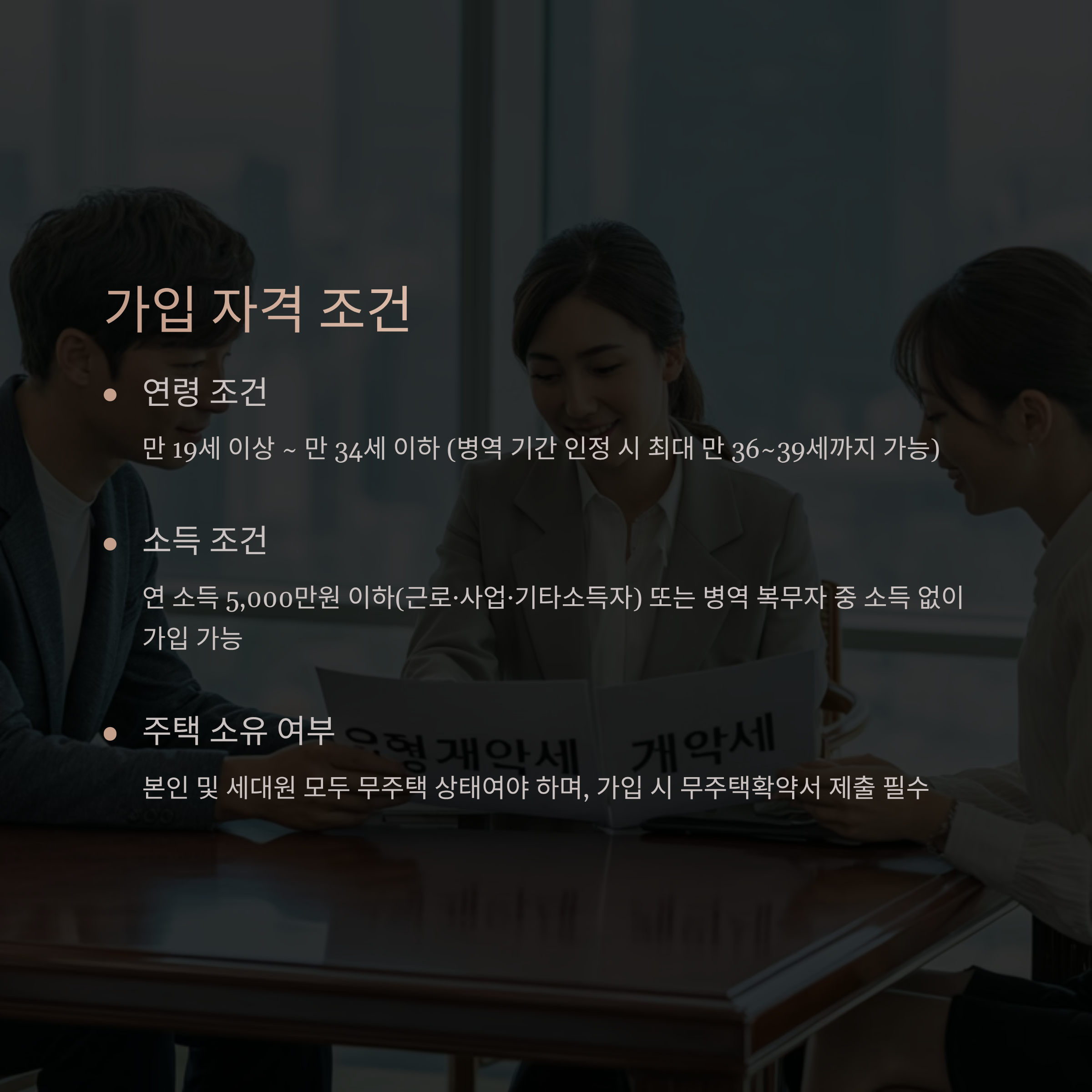 - 소득: 연 소득 5,000만 원 이하(근로·사업·기타소득자 대상) 또는 병역 복무자 중 소득 없이 가입 가능 (국토교통부)