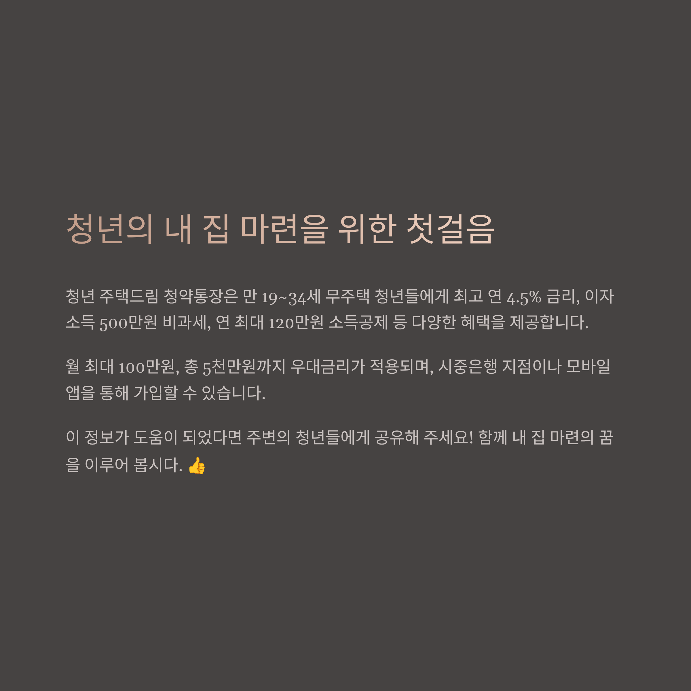 - 혜택: 최고 연 4.5% 금리, 이자소득 500만 원 비과세, 연 최대 120만 원 소득공제