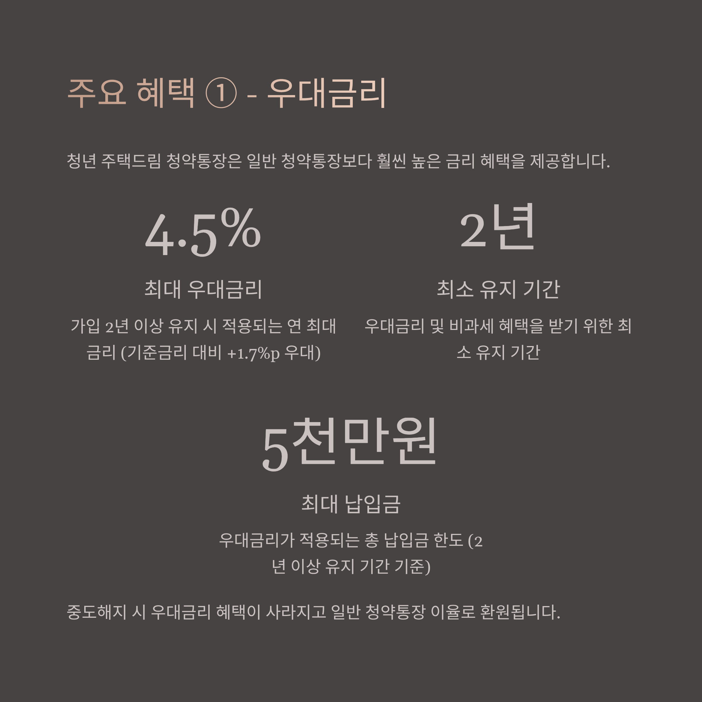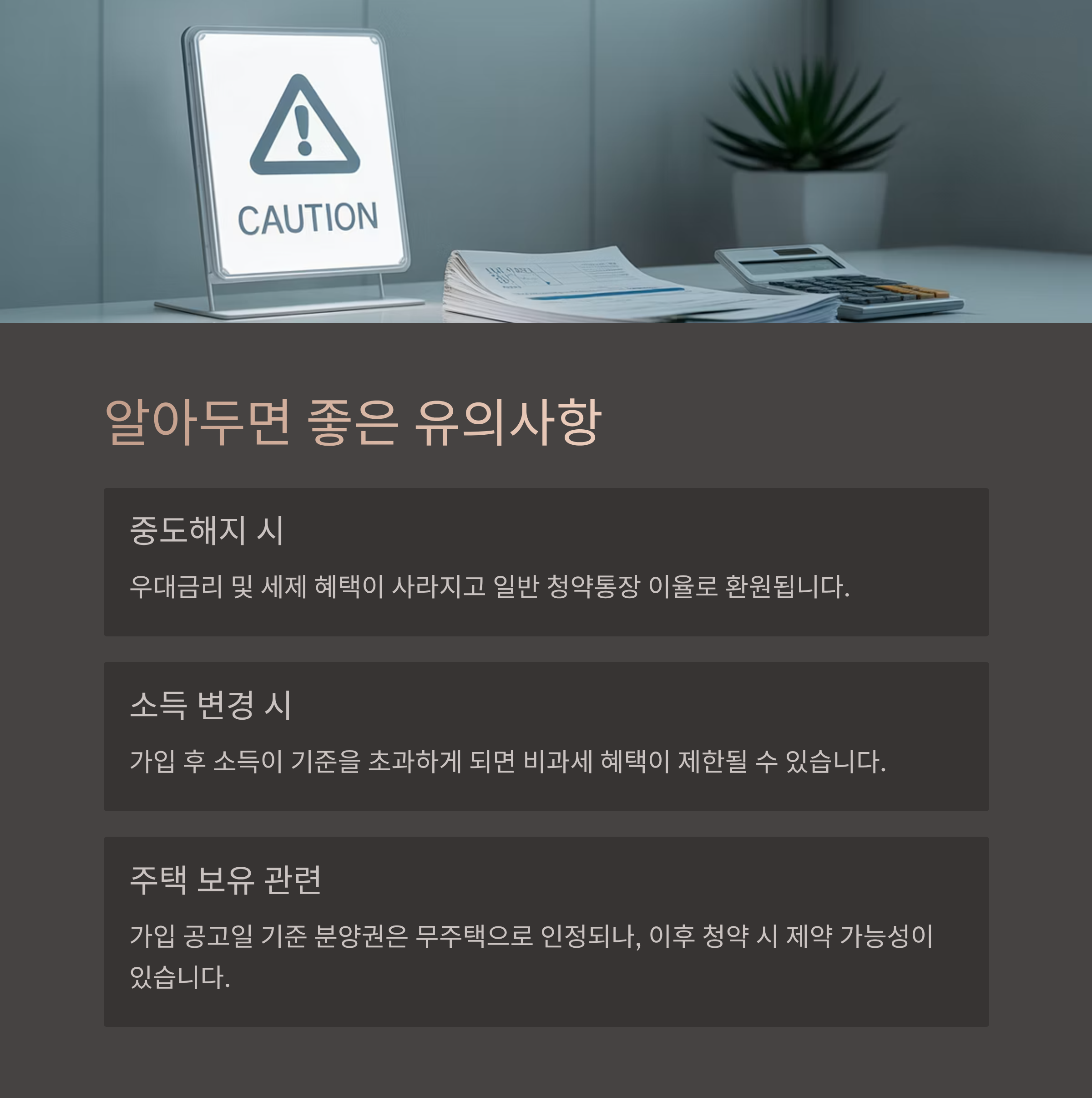 - 중도해지 시: 우대금리 및 세제 혜택이 사라지고 일반 청약통장 이율로 환원됨 (Brunch Story)