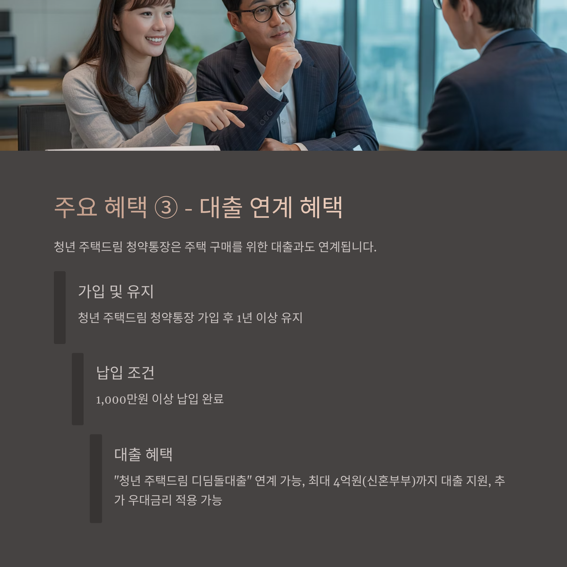 - 대출 연계: 통장을 가입 ≥1년 유지 및 1,000만 원 이상 납입 시 “청년 주택드림 디딤돌대출” 연계 가능. 최대 4억 원(신혼부부)까지 대출 지원, 추가 우대금리 적용 가능 (KB의 생각)