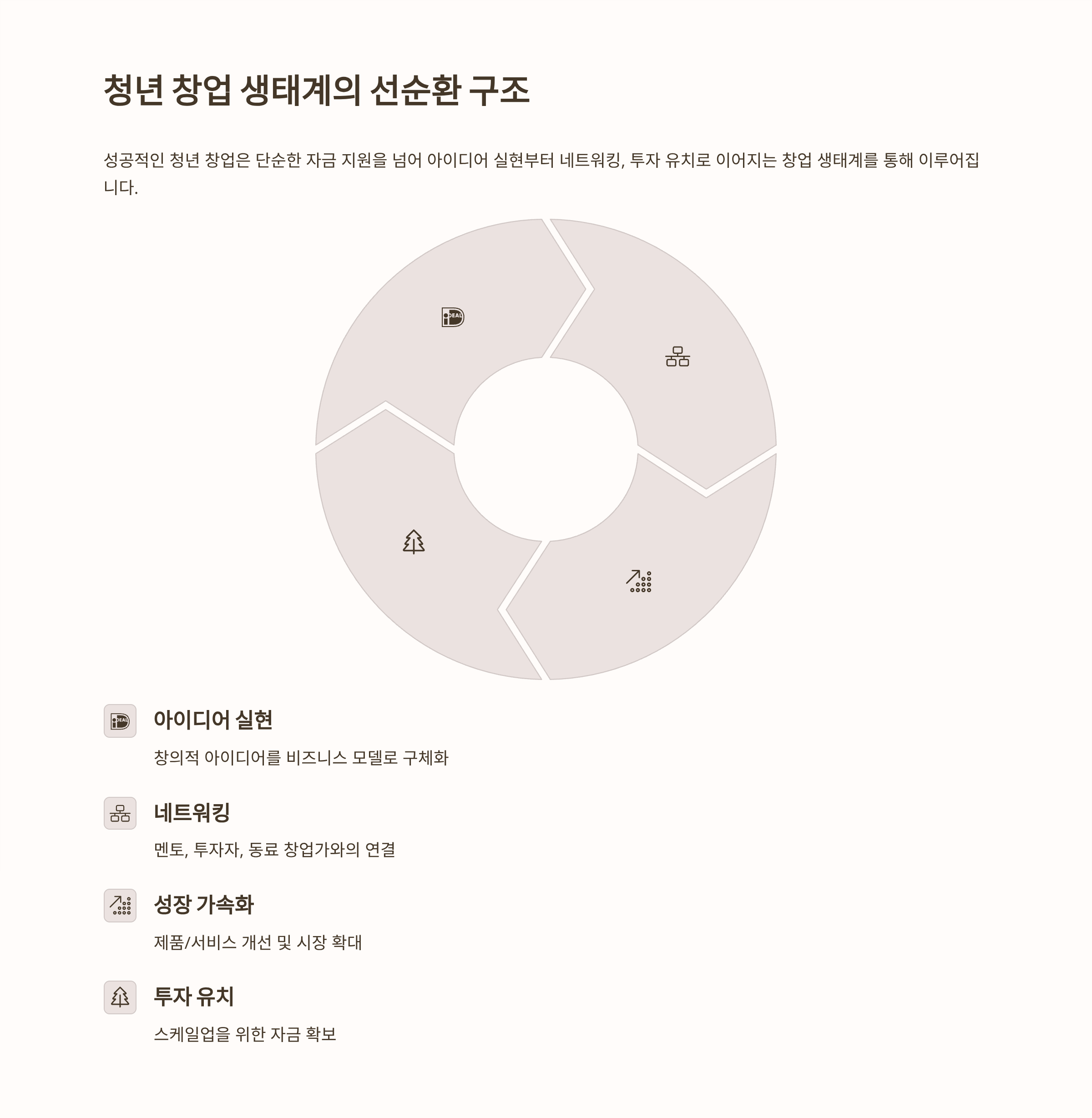 - 정부 주도 창업 지원 사업은 단순한 자금을 넘어 아이디어 실현 → 네트워킹 → 투자 유치로 이어지는 창업 생태계를 제공합니다.